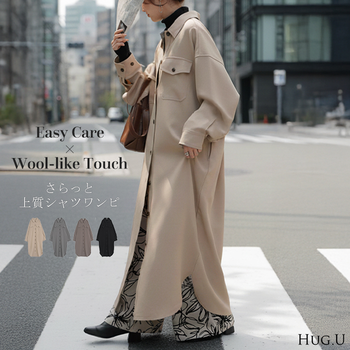 長袖ワンピース 長袖ワンピ 長袖シャツ 長袖シャツワンピース 長袖シャツワンピ ロングシャツワンピース マキシ マキシ丈ワンピース 襟付き 襟付きワンピース 襟付きワンピ 羽織り シワ シワにならない アイロン不要 ポケット付き ウール風 ウールライク レイヤードコーデ ブラック グレー アースモカ 黒色 灰色 ブラウン モカ 茶 茶色 旬 トレンド プラスサイズ ビッグシルエット ビッグ ビック big ビックサイズ ビッグサイズ オーバーサイズ 大きい 大きめ フリーサイズ フリー S M L LL 2L XL 3L XXL LLL カジュアル ベーシック オフィス オフィスカジュアル 着回し シンプル 大人 大人カジュアル オトナ 女性 綺麗 きれい キレイめ きれいめ 高見え 上質 上品 20代 30代 40代 50代 60代 おしゃれ お洒落 オシャレ 春 夏 秋 冬 春夏 秋冬 HUG.U HUGU ハグユー はぐゆー ワンピ ロングワンピ レイヤード 羽織 きれいめ 体型カバー 二の腕カバー