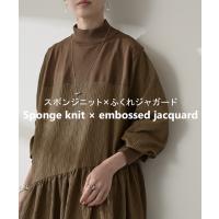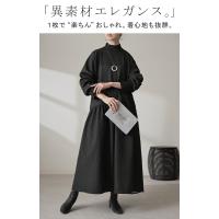 ワンピース 異素材 ジャガード スポンジニット ロング 長袖 ワンピ レディース ハイネック ロングワンピース 切り替え ドッキング Aライン