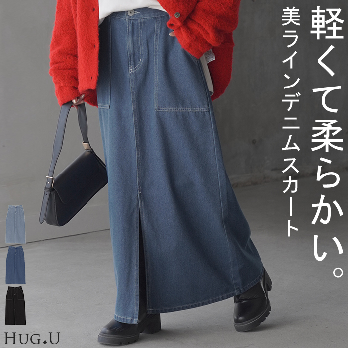 スカート レディース ボトムス ロングスカート ロング ロング丈 ロング丈スカート 長い 長め すっきり スッキリ 細見え 着やせ 着痩せ ロングデニムスカート 脚長 脚長効果 タイト ストレート ポケット ポケット付き スリット センタースリットスカート フロントスリット YKK ファスナー ブラック 黒 ブルー 青 青色 ネイビー 紺 紺色 旬 トレンド プラスサイズ オーバーサイズ 大きい 大きめ フリーサイズ フリー M L LL 2L XL 3L XXL カジュアル ベーシック 着回し シンプル 大人 大人カジュアル オトナ 女性 綺麗 きれい キレイめ きれいめ 高見え 上質 上品 20代 30代 40代 50代 60代 おしゃれ お洒落 オシャレ 春 夏 秋 冬 春夏 秋冬 HUG.U HUGU ハグユー はぐゆー マキシスカート ストレート ペンシルスカート スリット スリットスカート タイト ハイウエスト 大きいサイズ