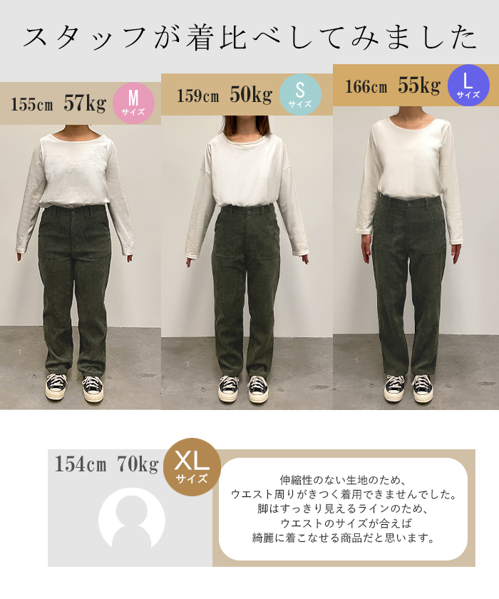 | サイズ | 総丈 | ウエスト | ヒップ | 股上 | 股下 | わたり幅 | 裾幅 |