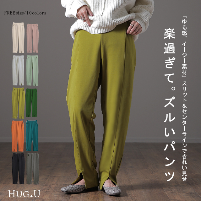 ロングパンツ センターライン センターラインパンツ フロントスリット スリットパンツ イージー イージー素材 リラックスパンツ おうち時間 お家時間 ハイウエスト ストレスフリー ストレッチ ストレッチ素材 ストレッチパンツ ハイウエストパンツ ストレート ロング丈 ナチュラル フレア ゴムウエスト ポケット ブラック 黒色 ミント グリーン 緑 ライム キャロット オレンジ 橙色 ライトグレー グレー 灰色 チャコール ベージュ オフホワイト カラバリ 部屋着 パジャマ ルームウェア 楽ちん 動きやすい 脚長 シンプル カジュアル テレワーク リモートワーク 母の日 プレゼント ギフト 贈り物 大人カジュアル 女性 フリーサイズ フリー S M L LL 2L XL 3L XXL LLL 20代 30代 40代 50代 おしゃれ 春夏 春 夏 秋冬 お洒落 オシャレ かわいい 可愛い カワイイ HUGU ハグユー はぐゆー 黒 大きいサイズ 楽 センタープレス カラーパンツ ゆったり ゆる ゴム スリット リラックス ワイド 秋