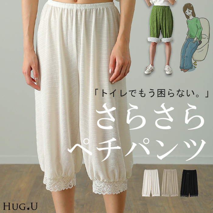 インナーパンツ ペチ ペチパン ペチコート 裾パンツ レースペチパンツ レースペチ ロング ワイドパンツ用 ゴムウエスト ウエストゴム 下着 下着ライン パンツライン 肌着 素肌 ランジェリー サラサラ 涼しい 軽量 軽い 7分丈 薄手 清潔 裾上げ 邪魔 パンツ対策 裾が着く 吸汗速乾 吸汗 速乾 フレア キュロット ペチコートパンツ キュロットパンツ 高級感 高級 上質 上質感 動きやすい レイヤード 重ね着 重ね 体型カバー 着痩せ 大き目 大きい 大きめ フリーサイズ フリー S M L LL 2L XL 3L XXL LLL カジュアル ナチュラル 大人カジュアル おうち時間 お家時間 着回し 母の日 プレゼント ギフト 贈り物 クリスマス 大人 オトナ 女性 綺麗 綺麗目 きれい キレイ キレイめ キレイメ きれいめ 高見え 上質 上品 20代 30代 40代 50代 おしゃれ お洒落 オシャレ 可愛い かわいい カワイイ ブラック 白 ホワイト アイボリー エクリュ 春 夏 秋 冬 春夏 秋冬 HUG.U HUGU ハグユー はぐゆー