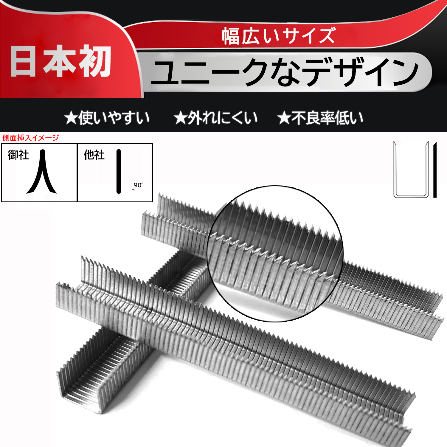 【サイズ】J10パラメータ :ステープル1022J (足長22mm)、1019J(足長19mm)、 1016J(足長16mm)、1013J (足長13mm) 、 1010J(足長10mm)、足幅11.2mm×厚さ1.2mmです。J4パラメータ ステープル422J (足長22mm)、419J(足長19mm) 、 416J (足長16mm)、 413J (足長13mm)、 足幅5.2mm×厚さ1.2mmです。