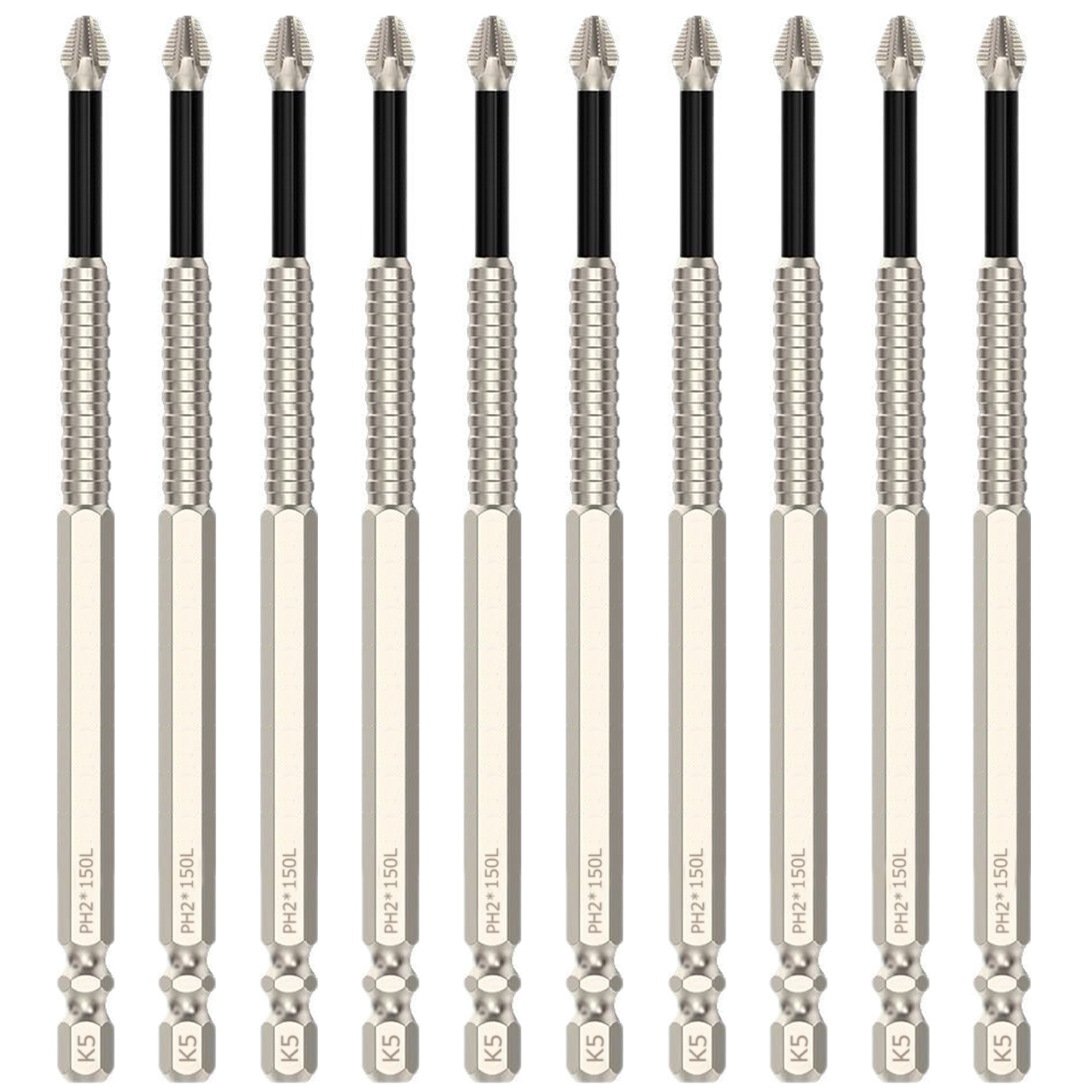 【十字ドライバービット商品仕様】全長150mm六角軸直径6.35mm、数量10本セット。