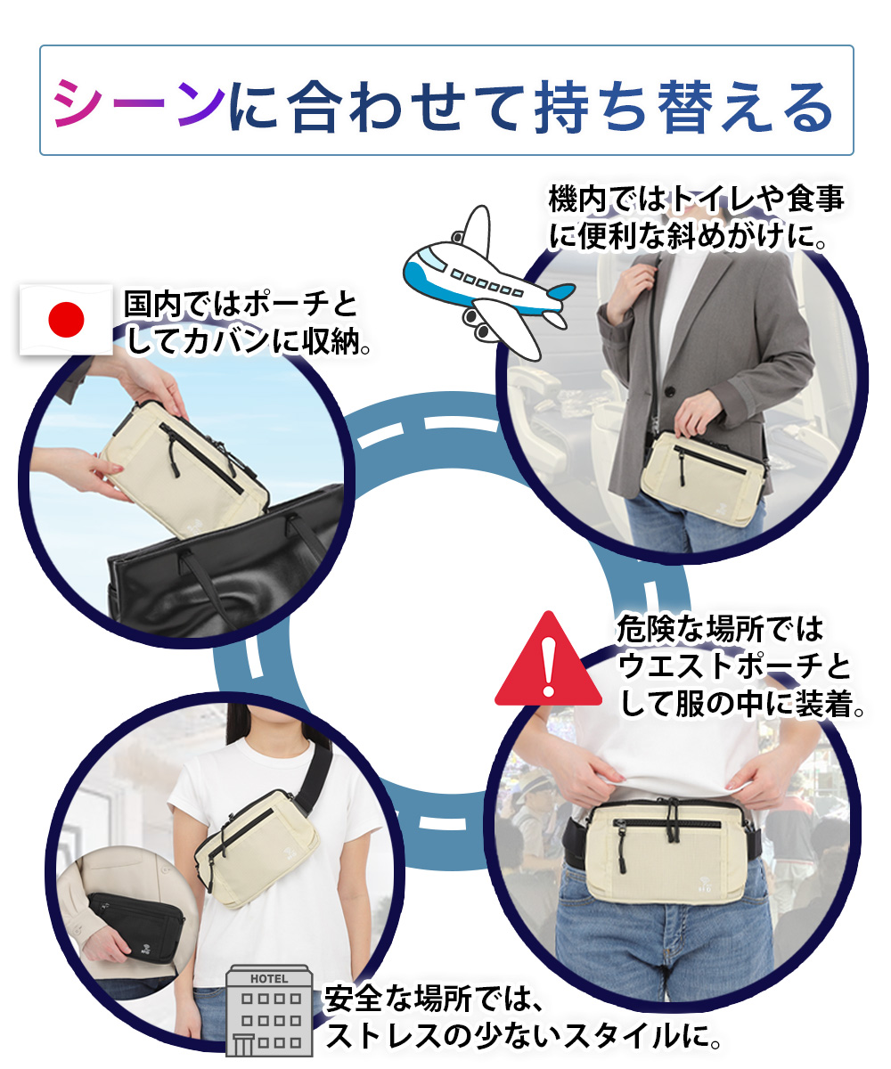 シーンに合わせて、ウエスト/ショルダー/ボディ/ポーチ に使い分けることができます。