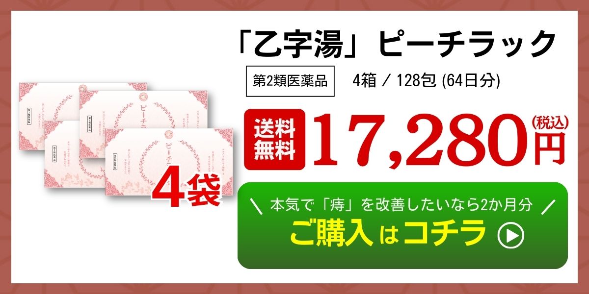 2包〔大人1日服用量〕中、次の成分を含有する 成 分 2包(5.0g)中乙字湯エキス(2/3量) 2.20g トウキ‥‥4.00g カンゾウ‥‥1.33g サイコ‥‥3.33g ショウマ‥‥1.00g オウゴン‥‥2.00g ダイオウ‥‥0.67g より抽出 添加物として、乳糖、セルロース、メタケイ酸アルミン酸Mg、ステアリン酸Mgを含有する |