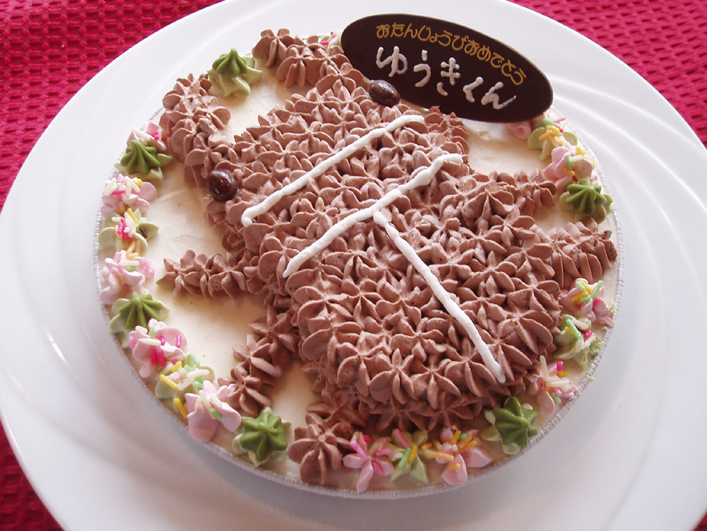 茶色の体に角が勇ましいクワガタがついに登場いたしました。男の子ならみんな大好きクワガタムシ!体はチョコ生クリームでデコレーションし、周りは苺生クリームと抹茶生クリームにカラフルチョコでかわいく飾りました。これからの季節のお祝いにはぴったりですね!