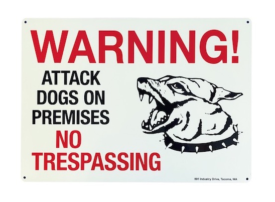 立ち入り禁止エリアに入ったら犬を攻撃させるからね!なんて内容です。見るからに強そう&怖い犬のイラストなので効果が期待出来そうです。