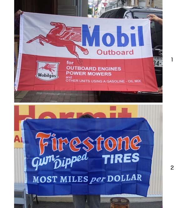 大きい翼が生えた赤いペガサスが大きくデザインされた「Mobil(モービル)」と、グッドイヤーと並ぶ、北アメリカでもトップクラスのタイヤメーカー「Firestone(ファイアストン)」のフラッグです!