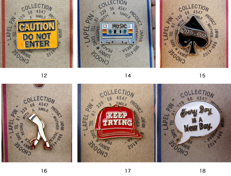 立ち入り禁止にカセットテープ、格好良いスペード、ガーターベルトにピンヒールを履いたセクシーな女性の足、赤い帽子、吹き出しが面白いピンズです。吹き出しの意味は「毎日が新しい日です」。