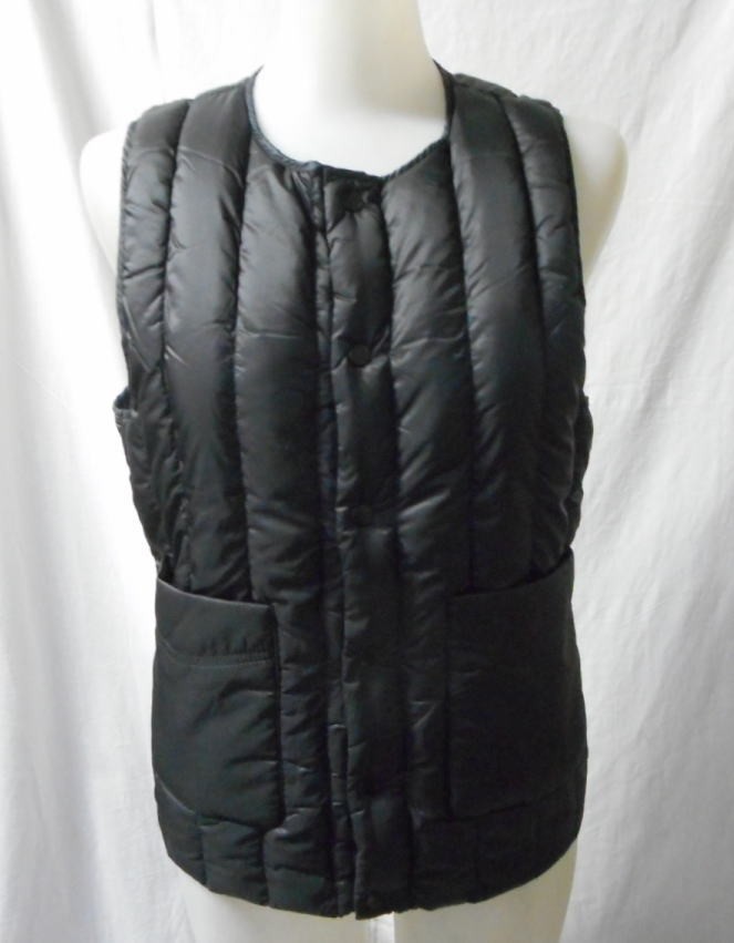 このベストはノーブランド品ですが、大手ブランド品生産工場より放出された商品のため、しっかりとした生地・縫製となっています。インナー用に生産されたものですが、中身が多めに入っているので、春秋にアウターベストとして、冬にはインナーベストとしてご着用いただけます。素材は表面・裏地ナイロン100%、中身はダウン90%・フェザー10%です。サイズは実寸で、S(胸囲92cm・着丈58cm・肩幅31cm)、M(胸囲96cm・着丈59cm・肩幅33cm)、L(胸囲100cm・着丈61cm・肩幅36cm)、XL(胸囲106cm・着丈63cm・肩幅38cm)くらいです。注:ホック仕様のため、優しく着用してください。また、ダウン製品の場合、多少の羽が外に出てくる場合が御座いますので、ご了承ください。お手入れの際は、内タグの表示タグをご参照ください。