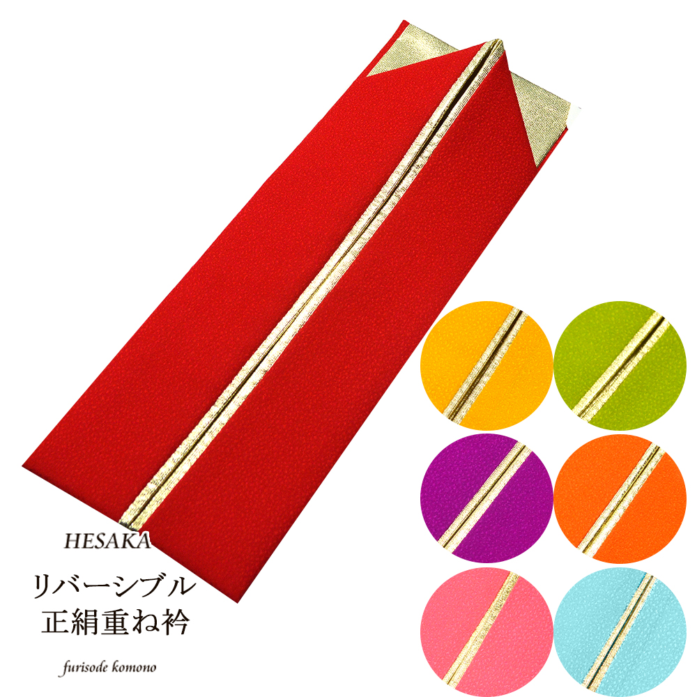 | ◆特徴 ・使い方は簡単! 備え付けの重ね衿ピンで、首後ろ側を3か所留めるだけ ・発色が美しい正絹のおしゃれな伊達衿です。 ・正絹生地とゴールドの組み合わせで華やかな印象となります ・着物姿、袴姿がゴージャスに見えます ・リバーシブルで、4通り使用できるので、お得感があります。 ・着物姿は衿元で印象が変わるもの。お好きな色でお楽しみください。 ◆用途 振袖/訪問着/小紋/紬/付下げ/パーティー/コンサート |