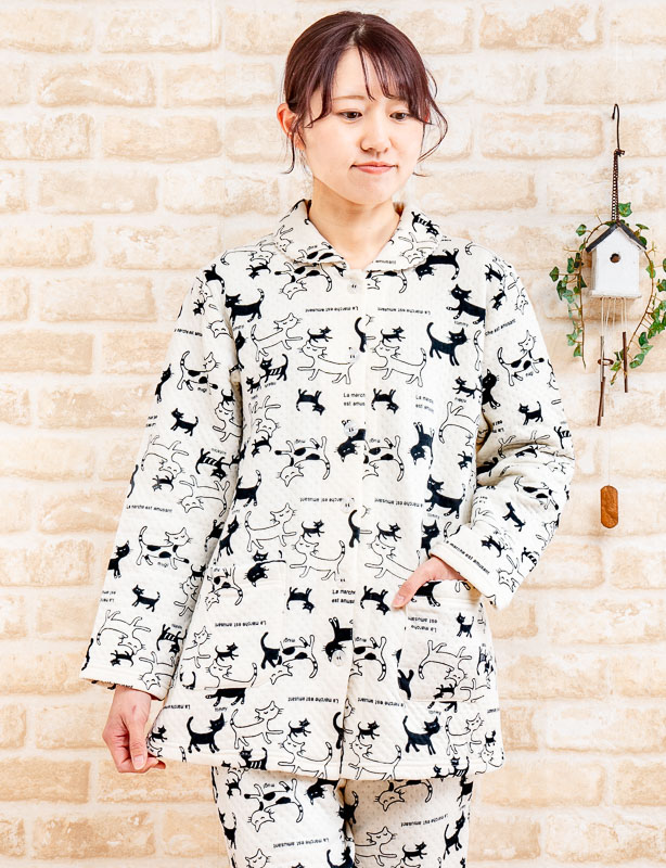 パジャマ レディース 長袖 前開き 冬 暖かく肌にやさしい綿100% 中わたニットキルト シルエット キャット S/M/L/LL/3L ナイトウェア ルームウェア ねこ 猫 ネコ