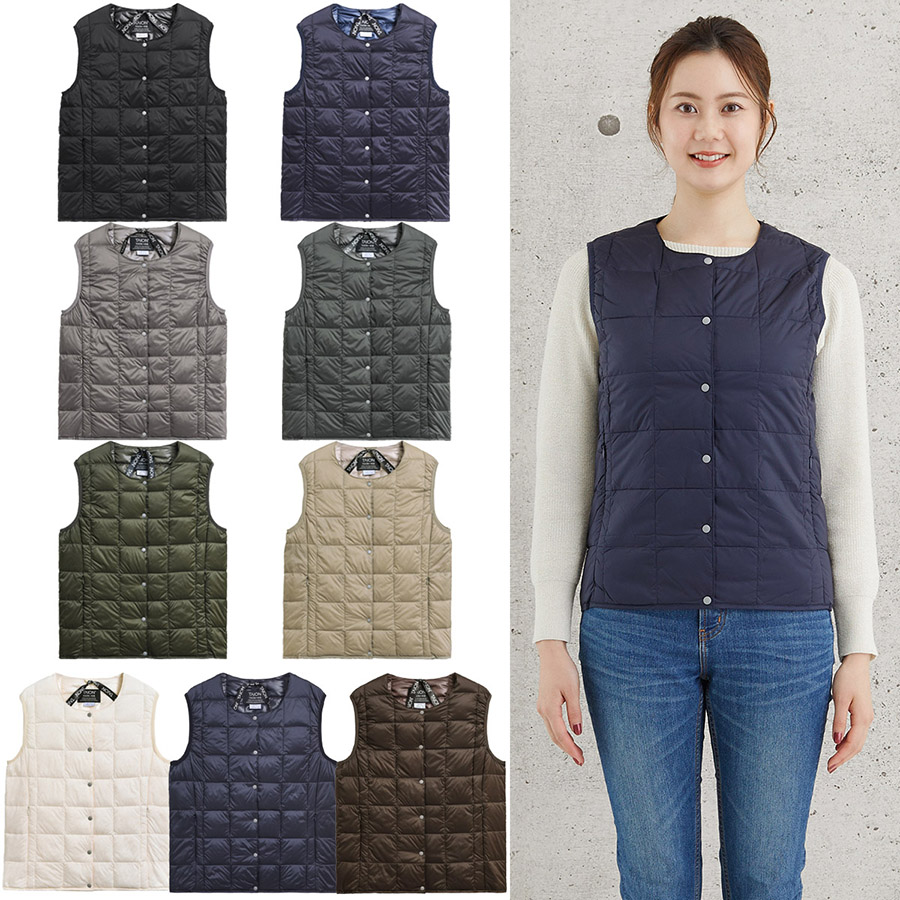 TAIONの定番、ベーシックインナーダウンは、ジャケットやコートの下に着るのはもちろん、Tシャツ・シャツ・パーカーなどの上にも気軽に羽織れる、軽くて暖かく着回しやすいシンプルなデザインが特徴です。ウエスト部分を少しシェイプすることで女性らしいシルエットになっています。