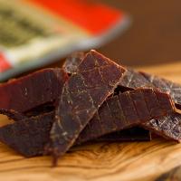 現在は、国内でアメリカ産と同様に、醤油ベースの味付けで、ステーキ用牛もも肉をそのまま3分の1になるまで乾燥させた本物のストレートタイプのビーフジャーキーです。