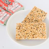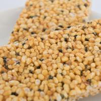 お米を粟粒状に炒り揃え、香ばしい胡麻を合わせ、さっくりとした歯ごたえが特徴の、砕いた米に水飴等で作ったシロップやゴマなどを混ぜて固めた伝統的な板おこしです。