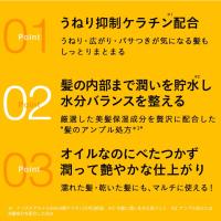 髪なじみのよい補修ケラチン*1と、プロポリス*2・ハチミツ*3をはじめとする栄養豊富な成分を厳選して配合した「髪のアンプル処方*4」。べたつかず髪にすっとなじみ、髪内部まで浸透して、ダメージを補修。パサつき・広がり・クセ・うねりを抑え、髪の芯から潤う艶髪へと導きます。ウェットヘア、ドライヘアのどちらでも使用可能。華やかで心地よいフルーティフローラルの香り。 *1 イソステアロイル加水分解ケラチン(羊毛)(保湿) *2 プロポリスエキス(保湿) *3 保湿 *4 アンプル処方とは美髪成分を配合した処方