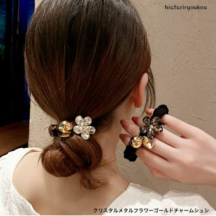 クリスタルメタルフラワーゴールドチャームシュシュ