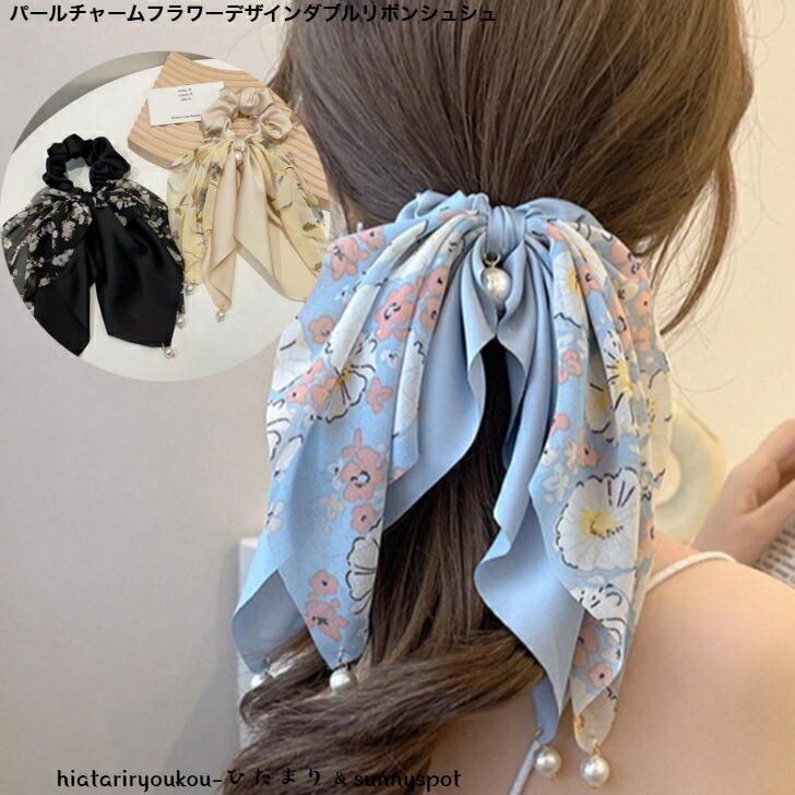 パールチャームフラワーデザインダブルリボンシュシュ