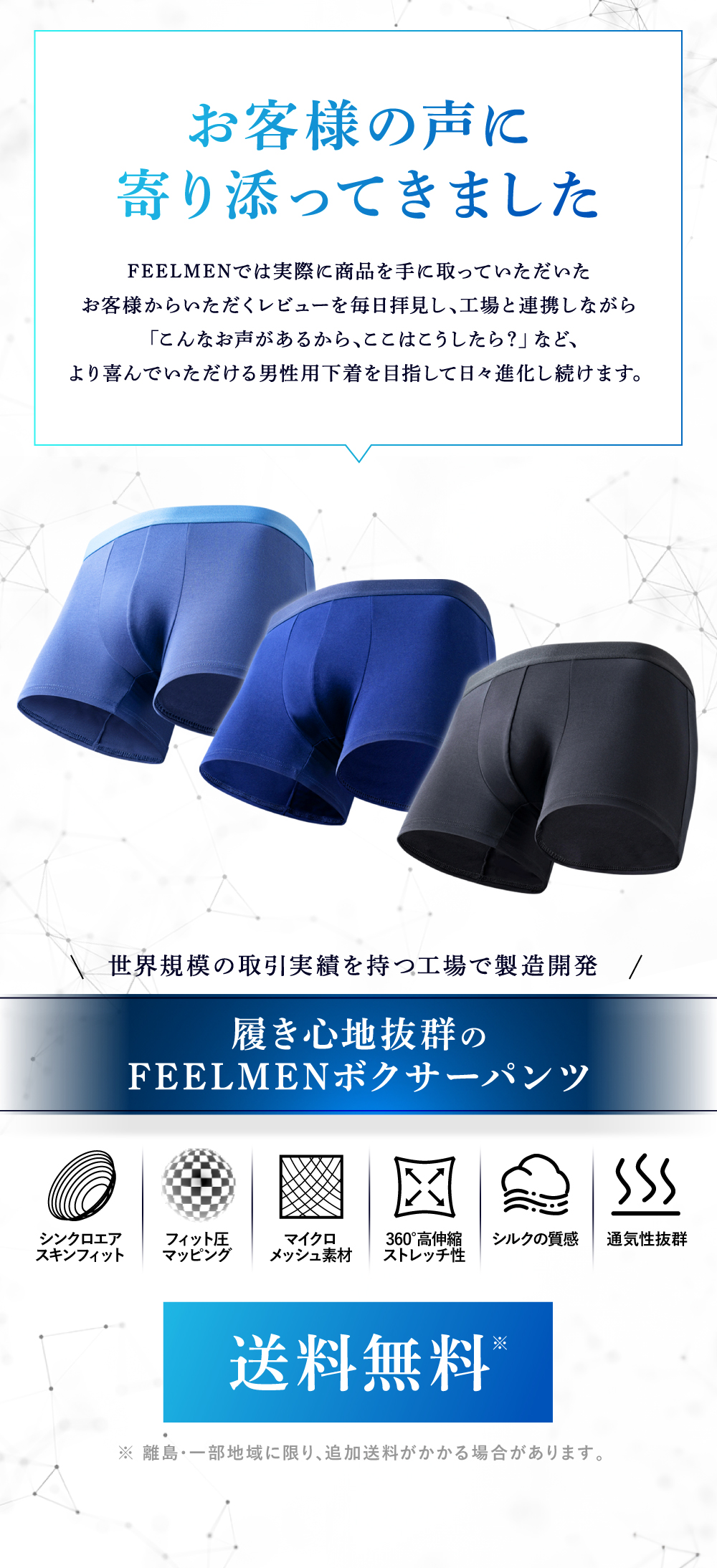 ■男性特有の蒸れやすい肌質を研究し、吸湿性に優れたマイクロメッシュ素材を採用!通気性抜群で、蒸れにくさと履き心地を両立しました。