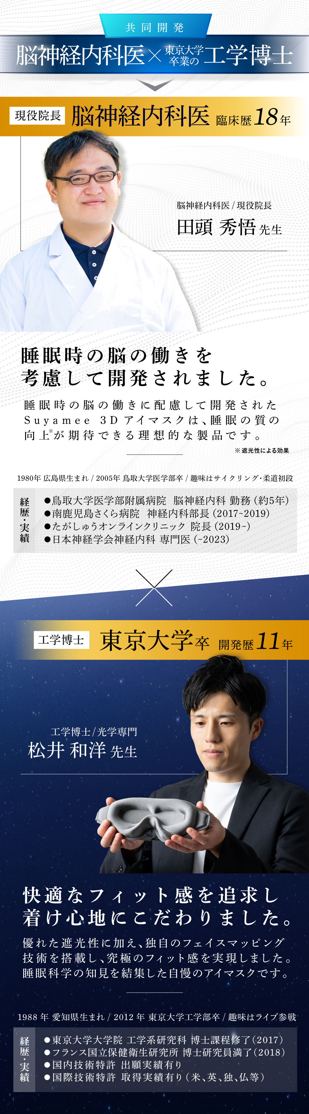 【 工学博士×脳の専門医が開発 】■東京大学出身で工学博士の松井和洋先生(開発歴11年)と、現役院長で脳神経内科医の田頭秀悟先生(臨床歴18年)が共同開発!先端工学と現代医学の知見を融合し、”究極の遮光性×フィット感”を実現しました。