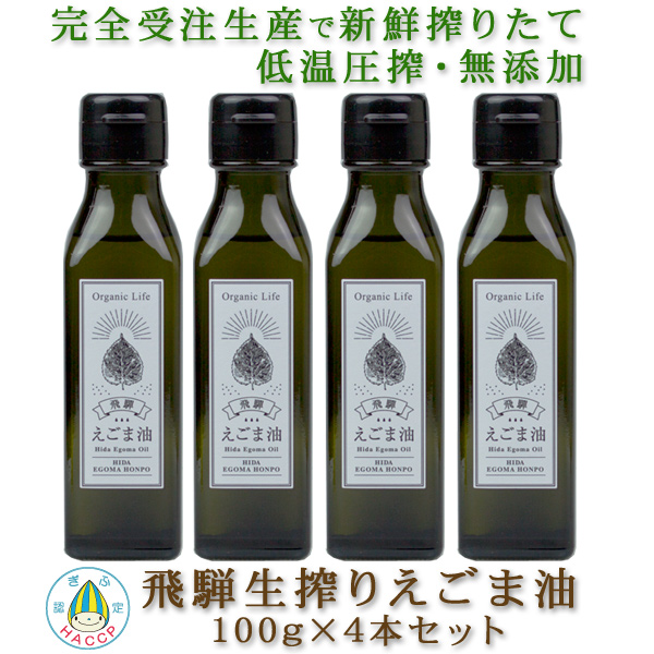 飛騨生搾りえごま油 100g 4本セット 国産 無添加 低温圧搾 α-リノレン酸豊富 受注生産 健康オイル 岐阜県HACCP認定工場生産 ギフト、お届けものに最適