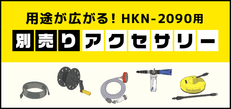 | 標準付属品 | トリガーガン、ランス(軸)、先端ノズル2種(バリアブル・ターボ)、HKN-2090用高圧ホース12m、本体側カップリング、耐圧水道ホース5m、水道蛇口側カップリング、接地アダプタ、ホースバンド、ノズルクリーナーピン、ガンホルダー、アクセサリー接続用ジョイント、取扱説明書(保証書付き) |