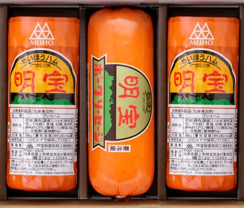 明宝ハム(プレスハム):肉塊(豚肉(国産))、つなぎ(豚肉(国産)、でん粉)、食塩、砂糖、香辛料、調味料(アミノ酸等)、リン酸塩(Na、K)、発色剤(亜硝酸Na)