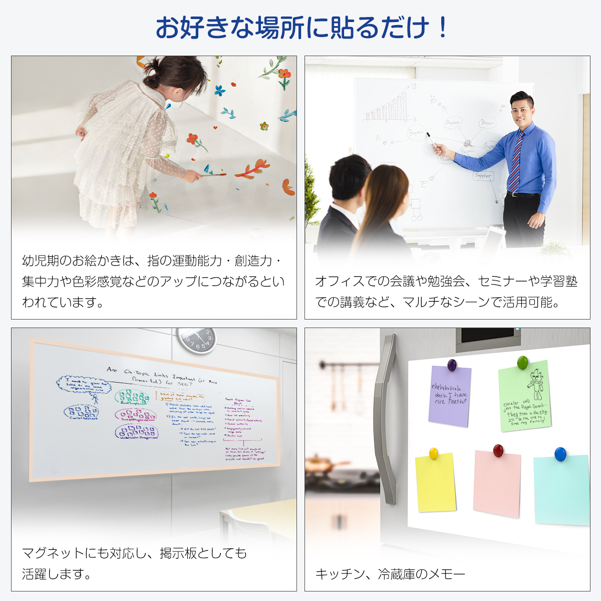 【爆買】様々なところに描ける空間を作り上げます!事務所の予定表、掲示板の知らせ、こどもの落書き、リモートの授業、壁に貼り買い物リストななどに使えるのは多いです。