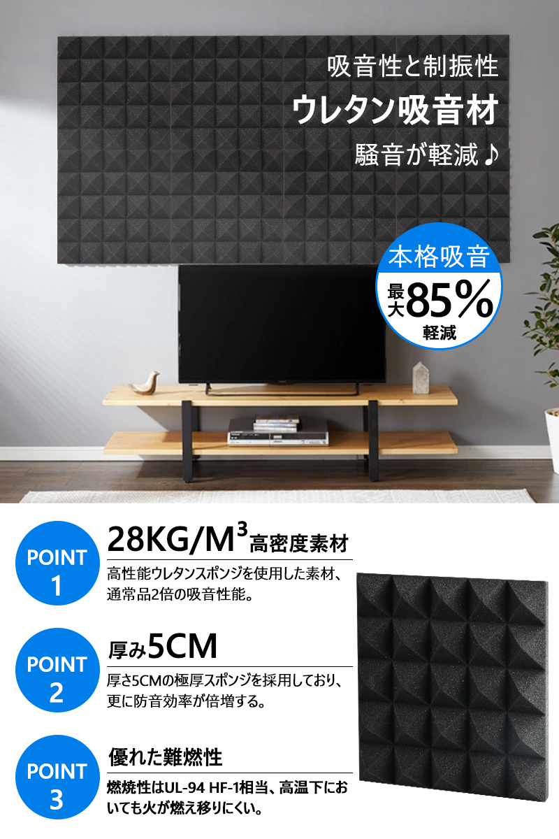 耐久性の高ウレタンフォームを使っているため、人が歩いた時の振動などでシートがヘタりにくく、長期間使用できます。吸音性だけではなく、難燃性や断熱性にも優れた素材なので、ご安心してお使い出来ます。ぶつかっても安全で、家庭やスタジオのどの場所にも最適です。大人、子供、ペットにも安全です。