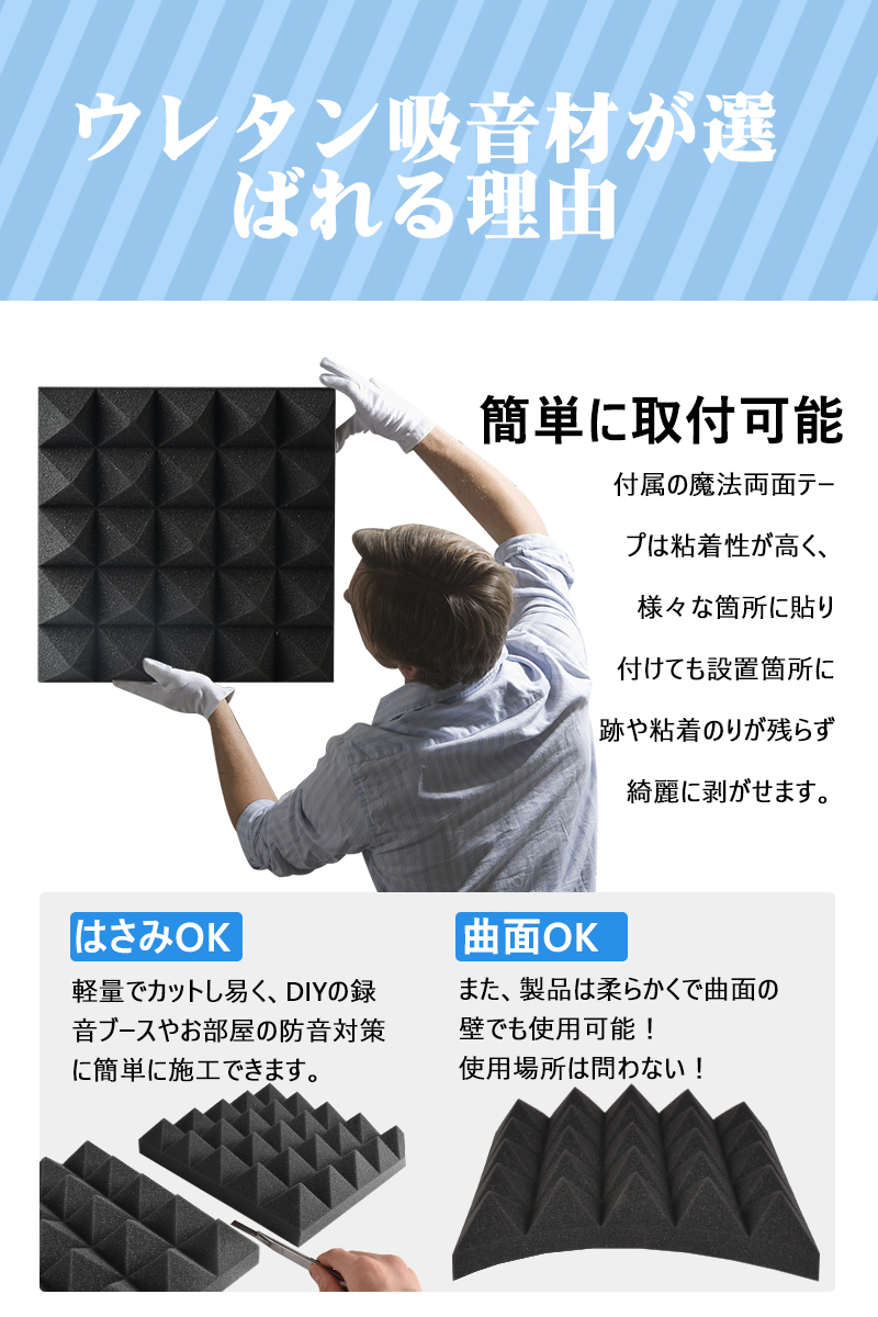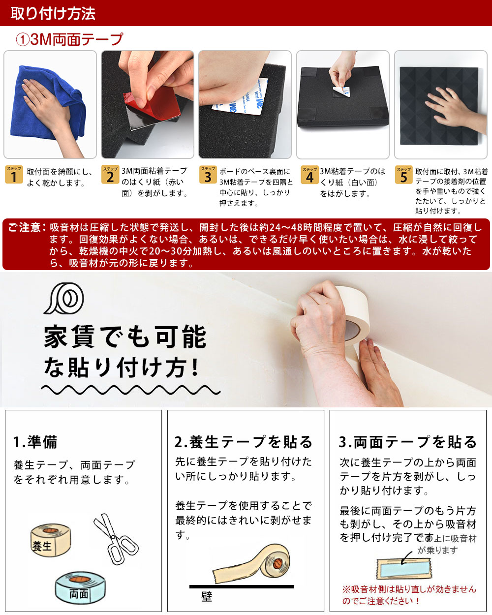 すぐに落ちてしまう普通の両面テープより、3M両面テープずっとしっかりしてるいるので、吸音材売上好評につき、今だけ3M両面テープ贈呈!固定するのも「養生テープ」(この場合の必要のものは別売になります)で簡単にでき、賃貸住宅などでDIY可能。