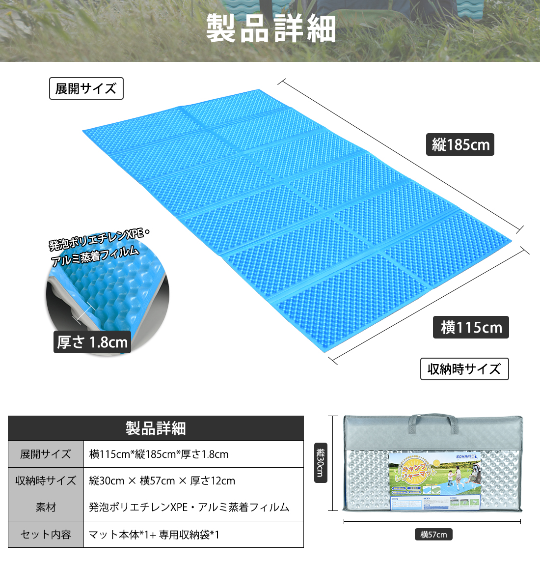 展開サイズ 185x115x1.8cm