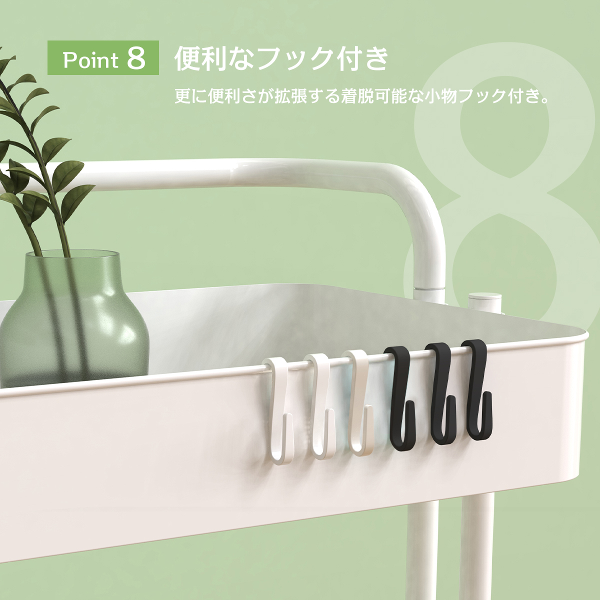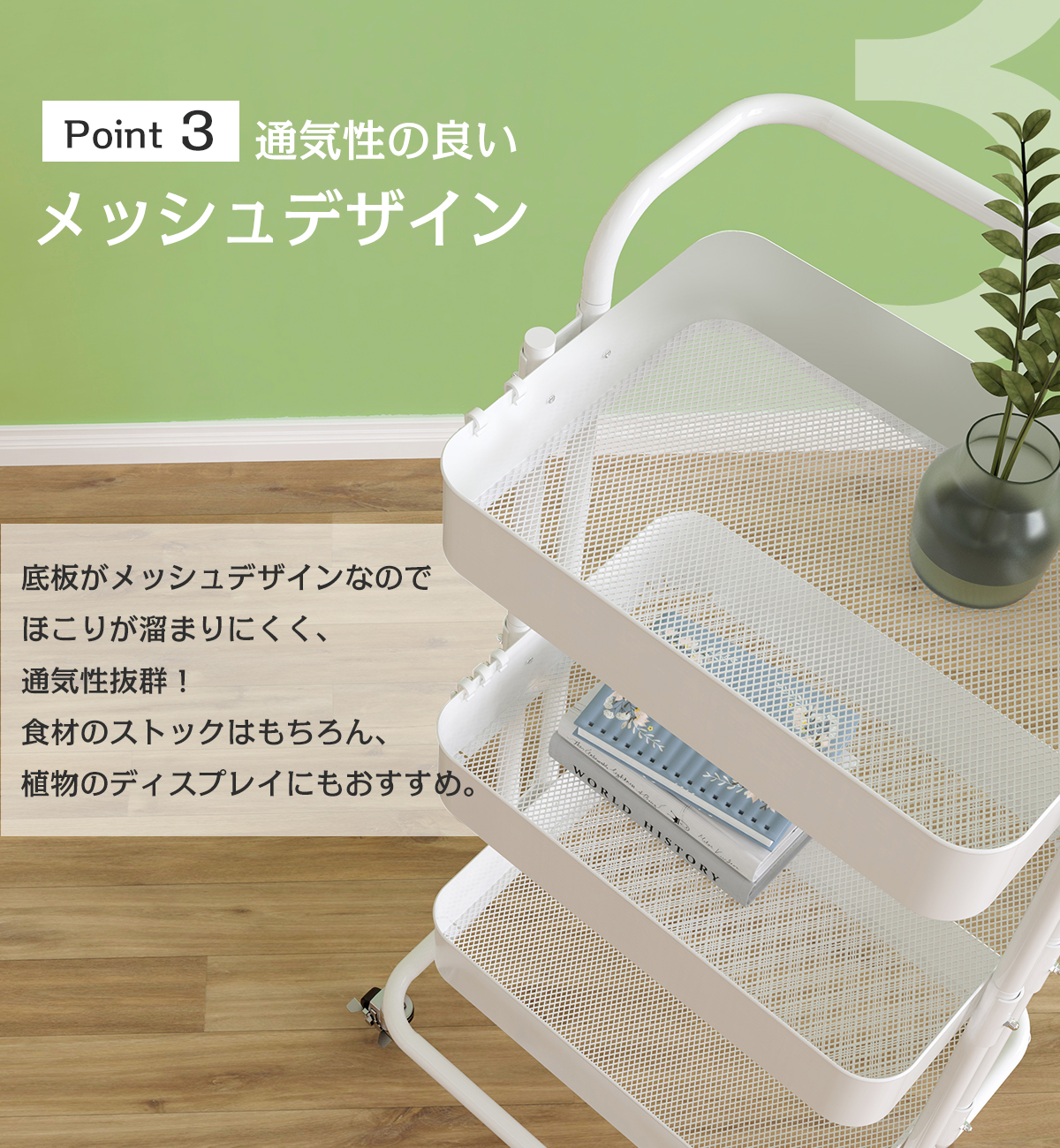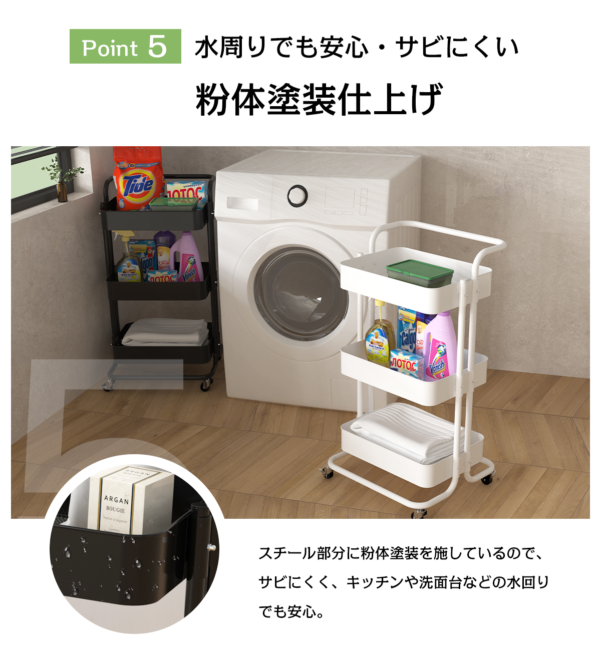 スチール部分に粉体塗装を施しているので、サビにくく、キッチンや洗面台などの水回りでも安心。