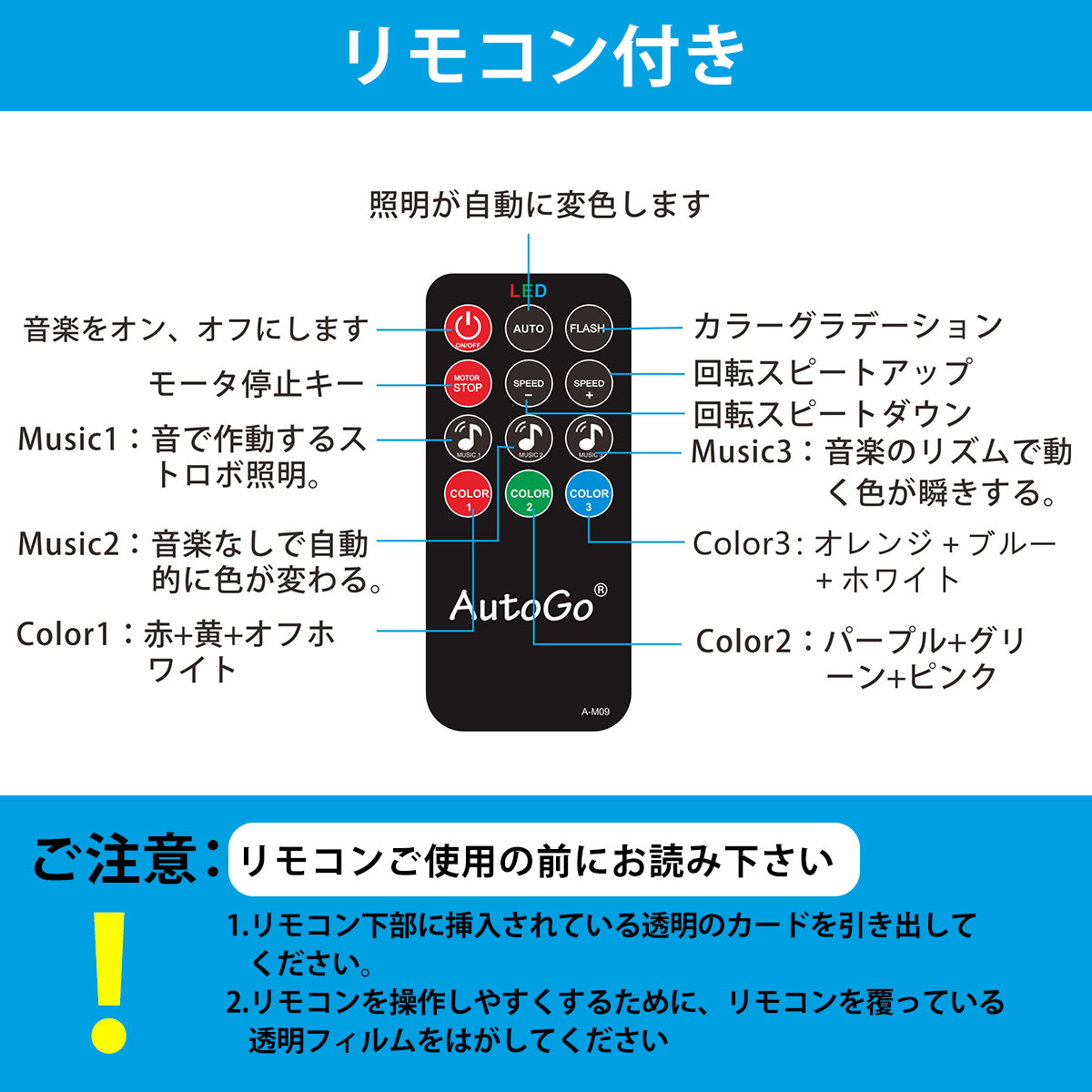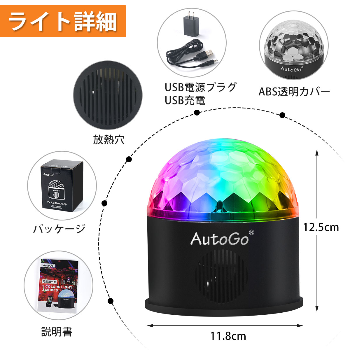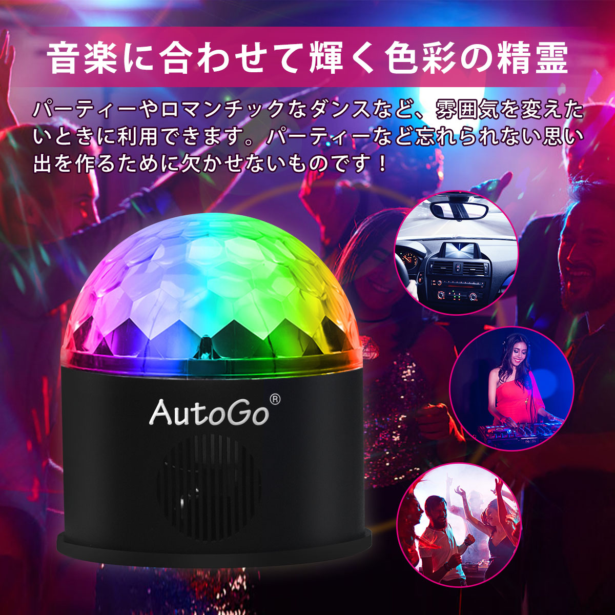 ミラーボールはカラフルなLED回転式クリスタルマジックボール、内蔵回転モーター操作で、9色(赤、橙、黄、緑、青、紫、白、オフホワイト、ピンク)の光を組み合わせて天井、壁、床に照射し、夢のような視覚空間を作り出します。ディスコライトは音楽モードがあり、音楽のリズムに合わせて様々な光を照射(演出)します。