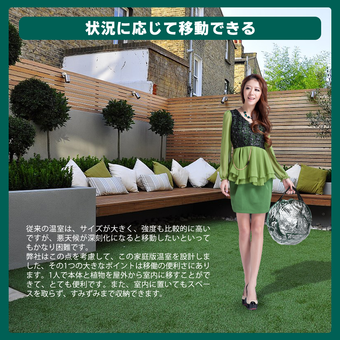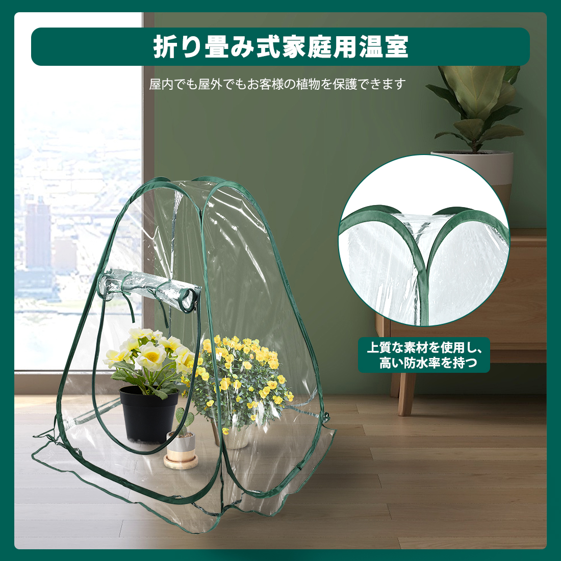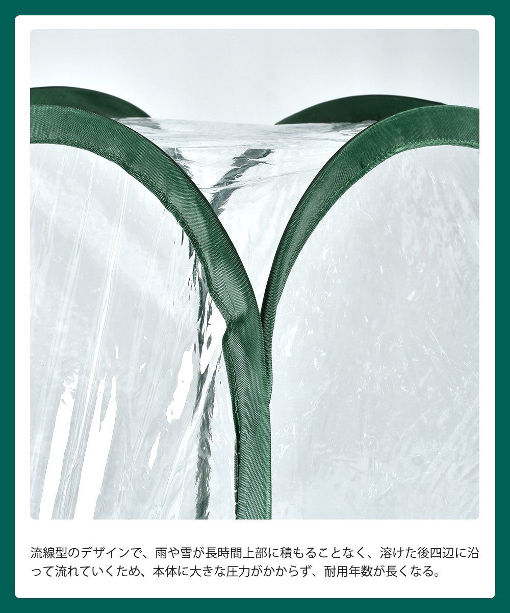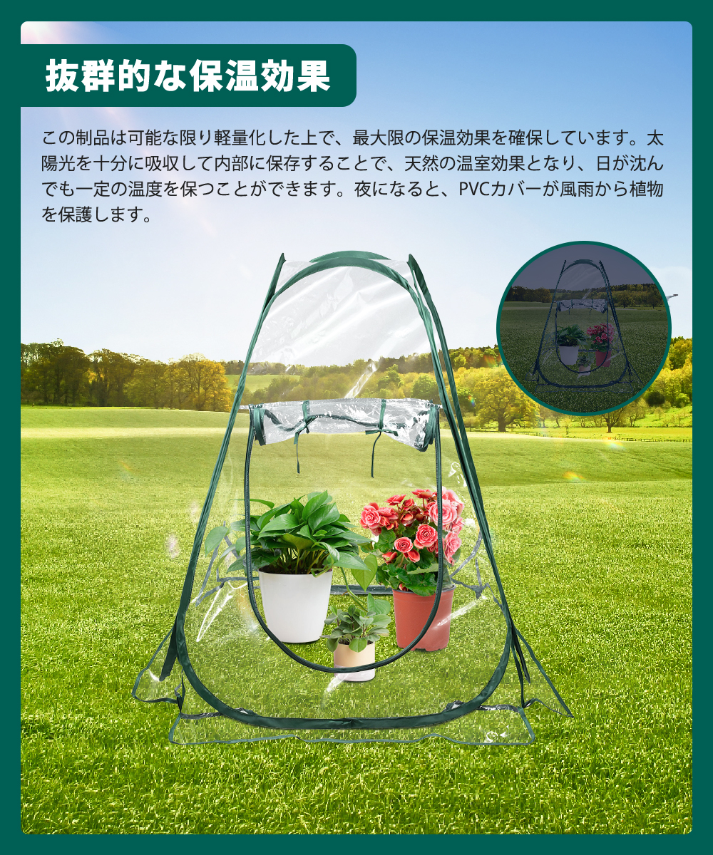 屋内外を問わず、舗装、ベランダ、庭など、どこでも利用できます。PVC透明カバーは晴天時、日光の熱を温室テント内に集めることができ、温室効果を作り出し、植物の成長を促進することができます。省エネ、炭素排出を減らし、寒い季節は植物の断熱性がよく、温室効果が植物の成長を促進する。どんな季節でも使える人気商品です!
