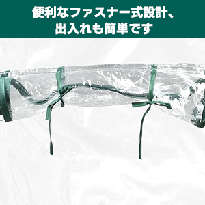 入口にはファスナーと固定テープがついていて、扉を巻き上げ、紐で固定すれば、水やり、施肥、自由換気など。