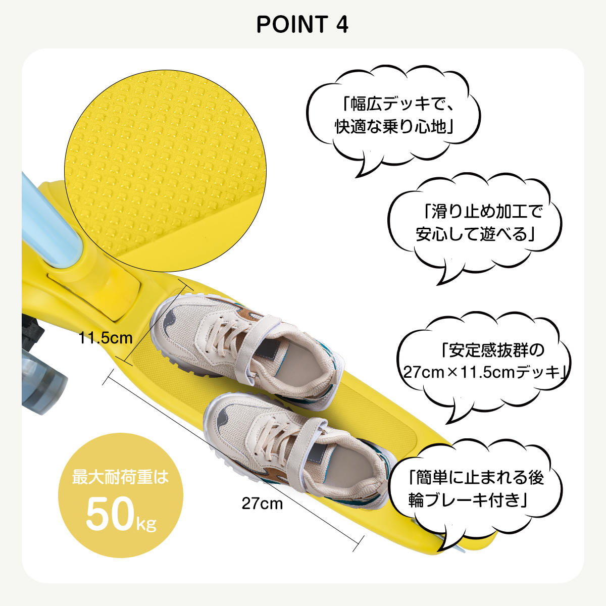 27 cm x 11.5 cmの広いデッキは滑り止め加工済