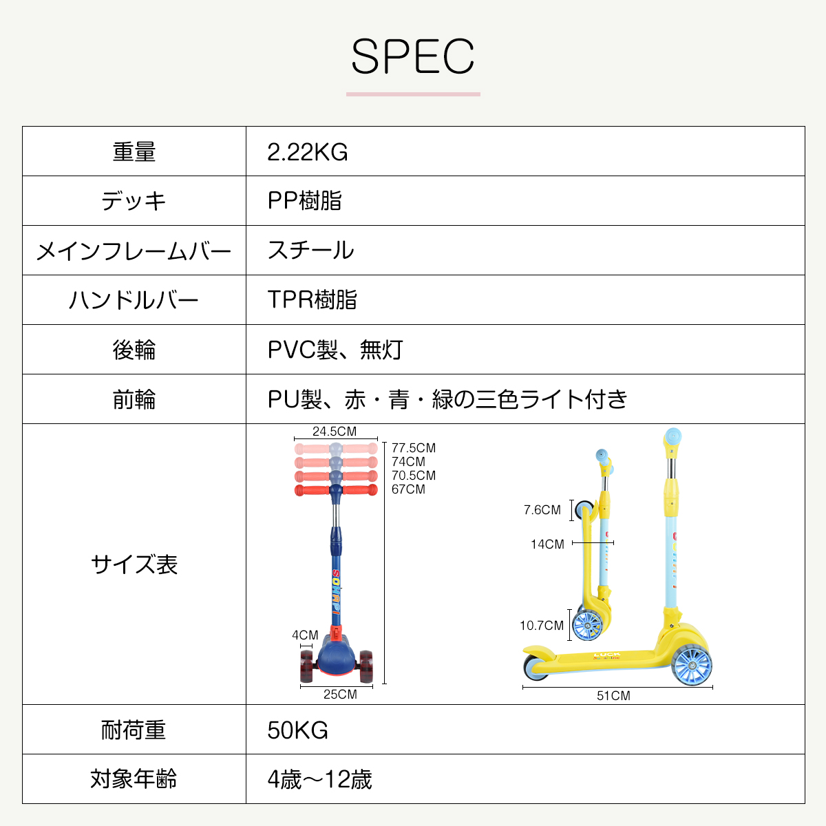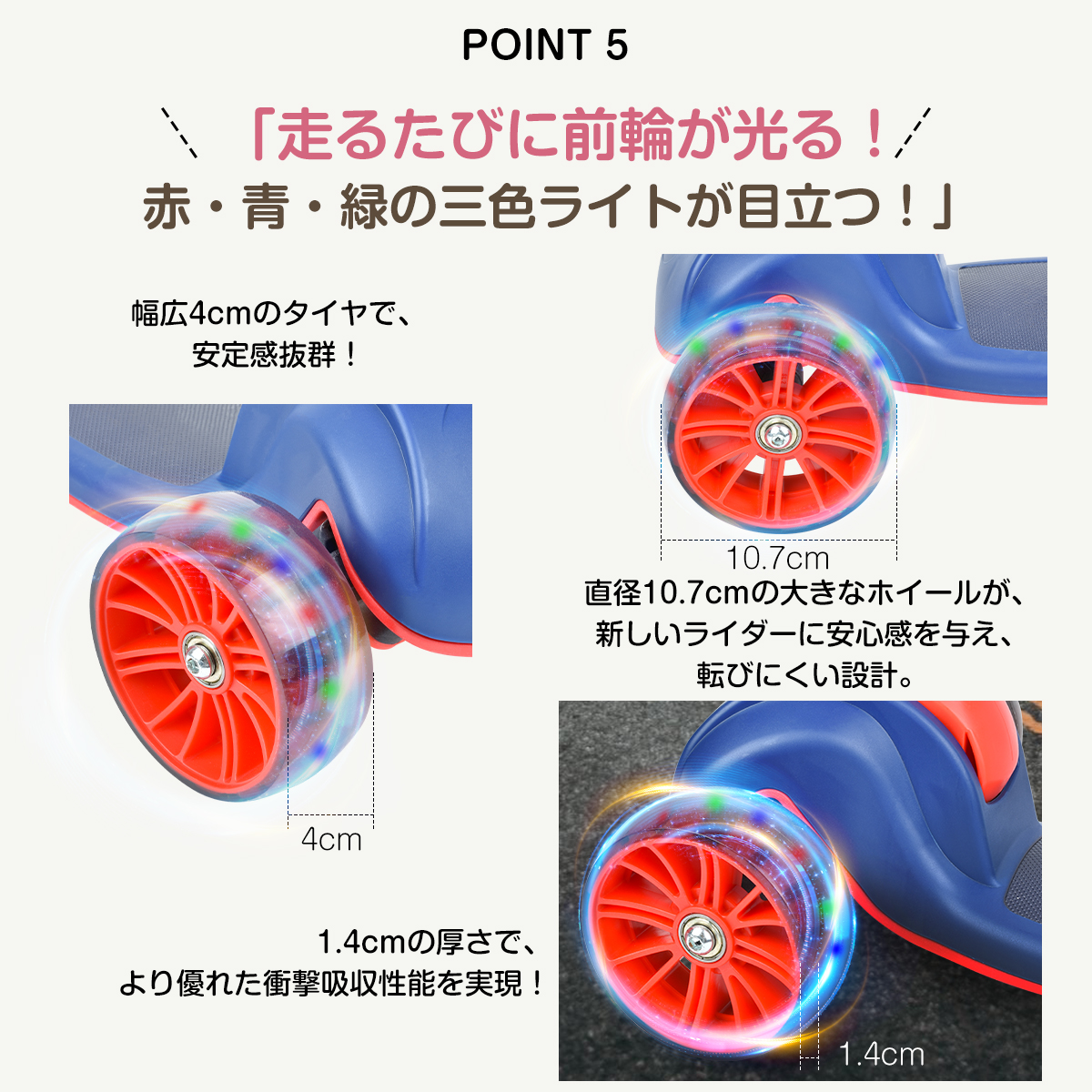 前輪:PU製、赤・青・緑の三色ライト付き