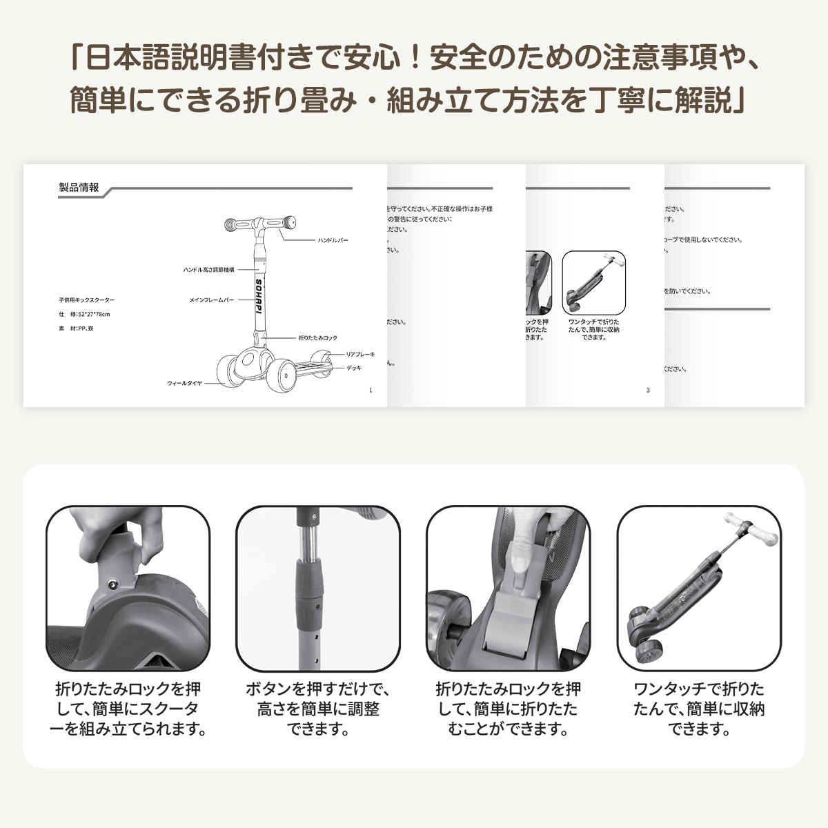 折りたたみロックを押すだけで簡単にコンパクトに収納。女性や子どもでも簡単に持ち運べます。
