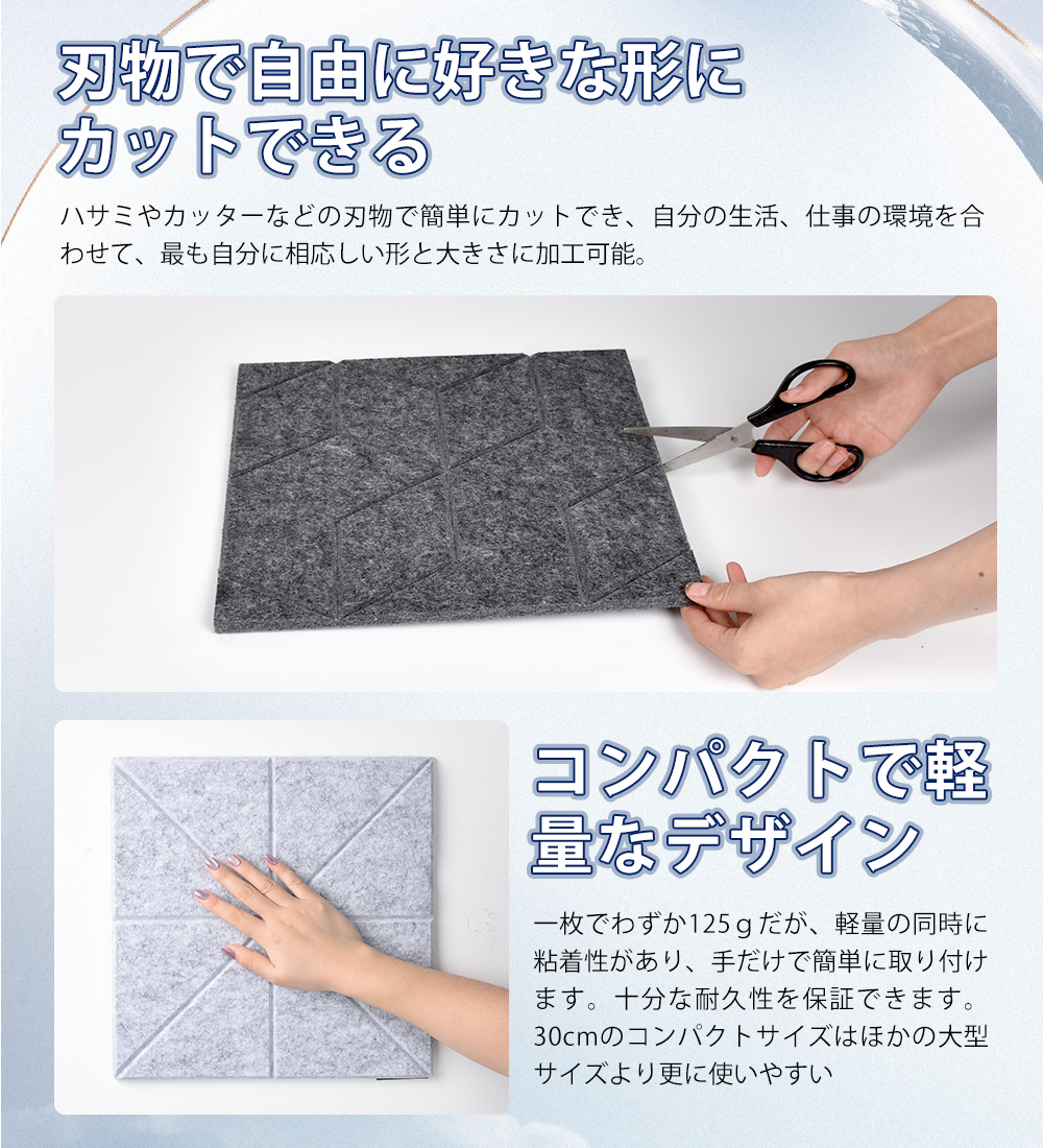 ハサミやカッターなどの刃物でも簡単にカットできるよにして、吸音性も兼ねて弊社の吸音材・吸音ボードは230kg / m3の高密度の100%ポリエステル繊維ででき、精度の高い設備で切断し、その上、スタッフの検品も実施し、防音シートの全体的な厚みの誤差を最小限にし、9mm左右にし、室内の壁・柱・床など必要なサイズに合わせて加工することが出来ます。