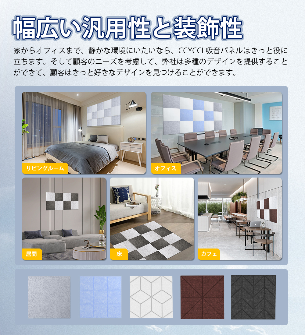 ※本製品の吸音効果は一定の実験条件や実験環境のもとで得たものなので、あくまでもご参考に。使用環境や設置方法により異なり、使用時の効果を保証することはできかねます。