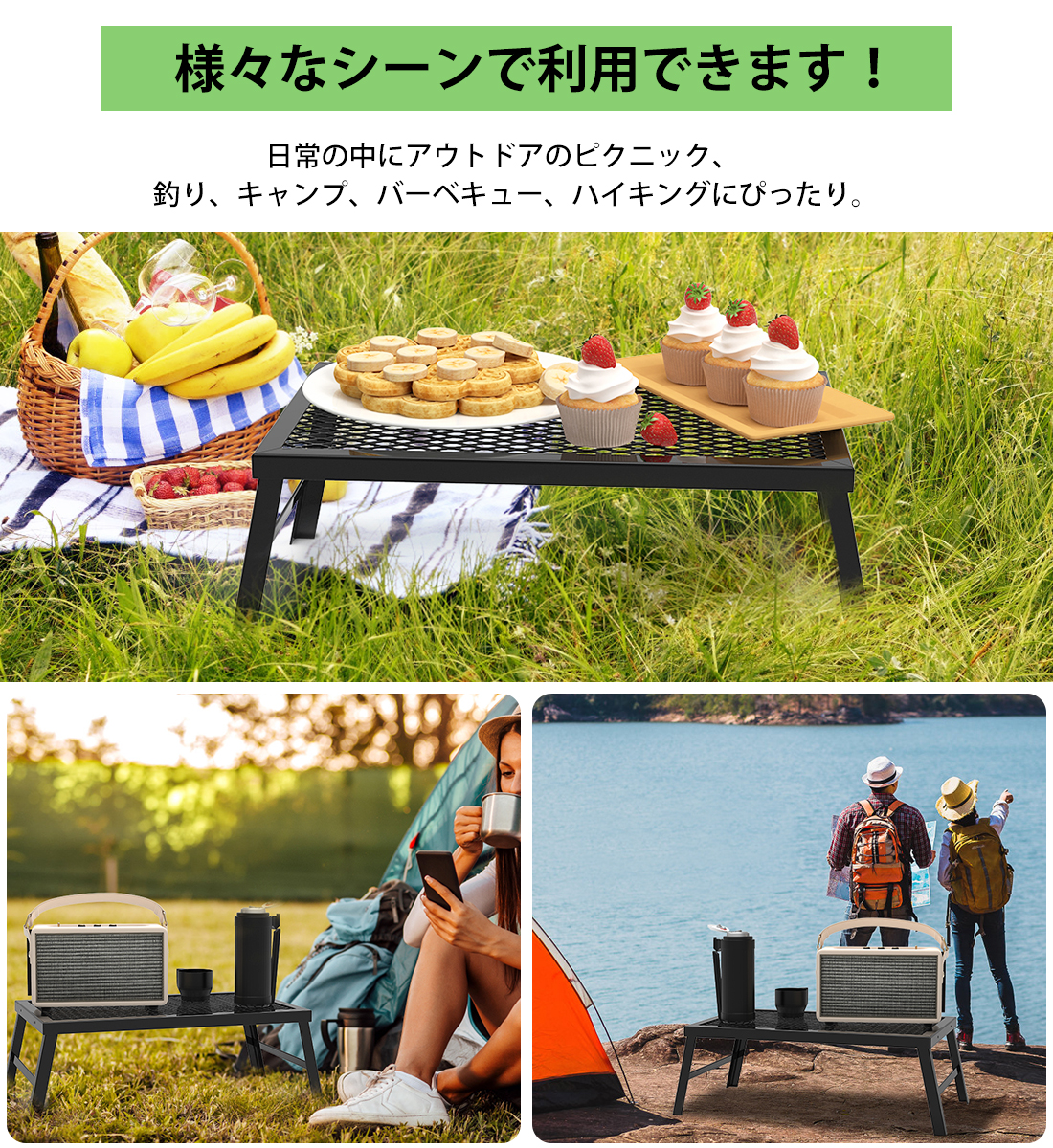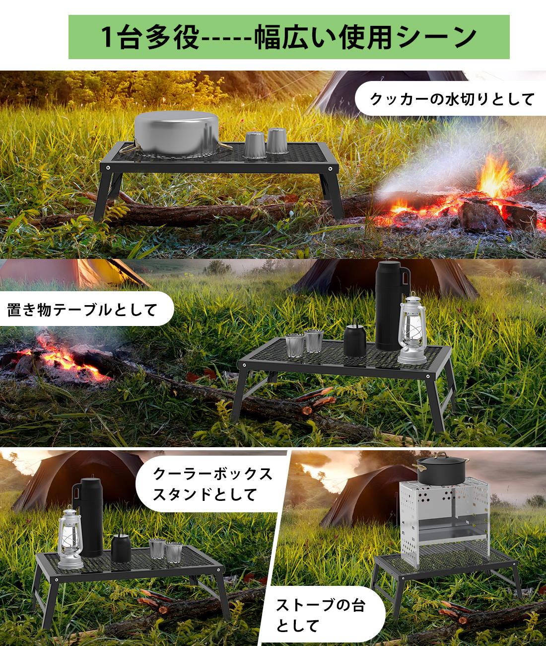 キャンプ、テント泊、ソロキャンプ、ピクニックやバーベキュー(BBQ)、ツーリング、登山などの活動に最適です!自宅でも野外でも使えます。アウトドアテーブル・大型ゴトク・物置テーブル・アウトドア調理台・クッカースタントとして使用可能なキャンプテーブルです。