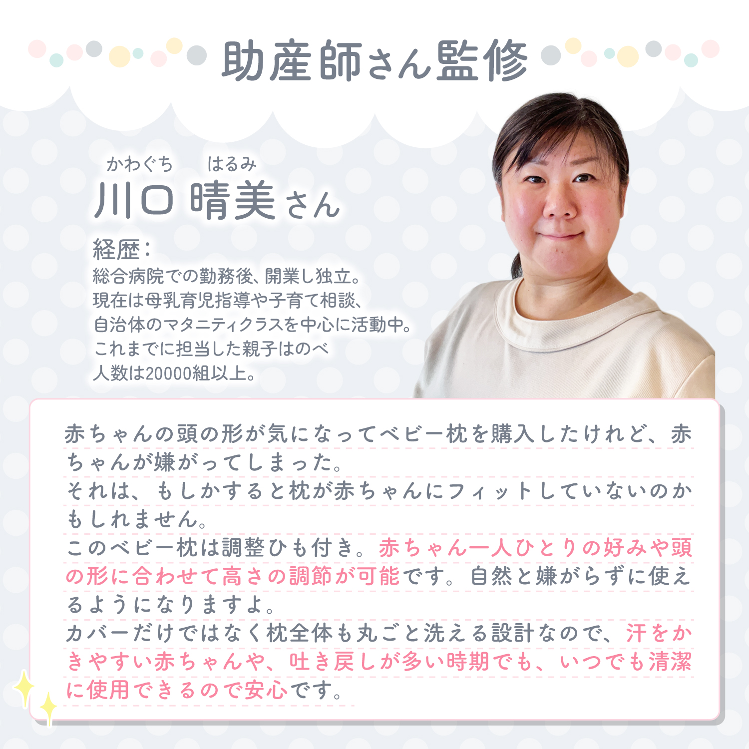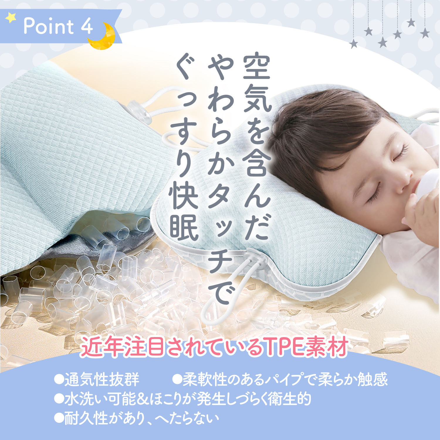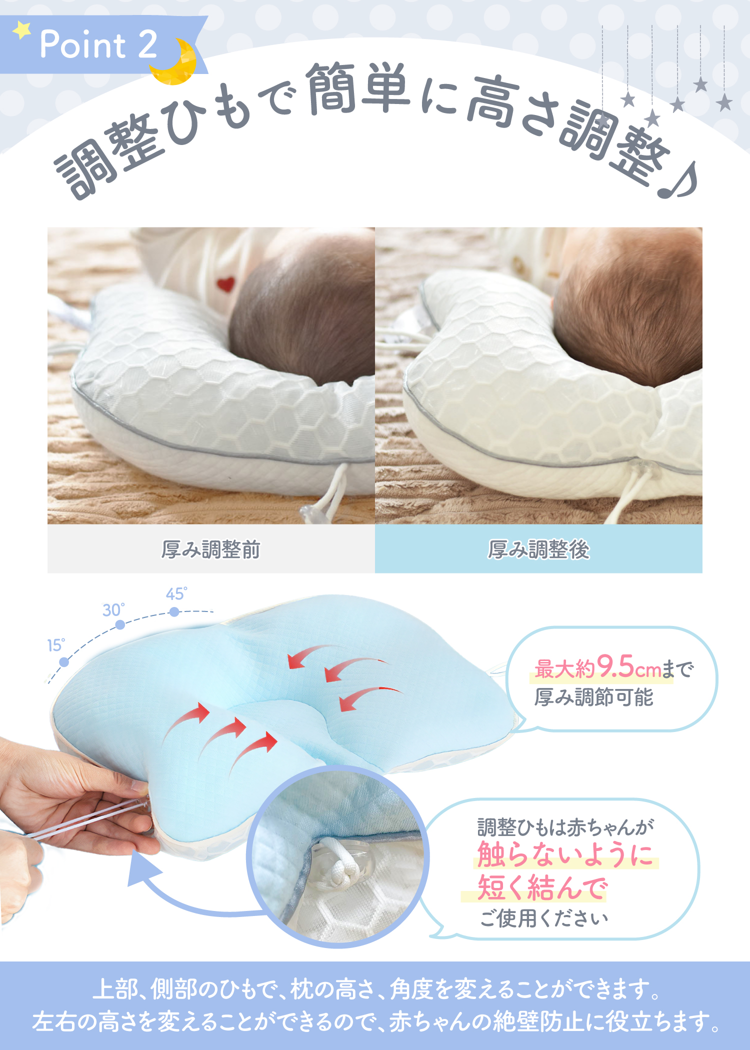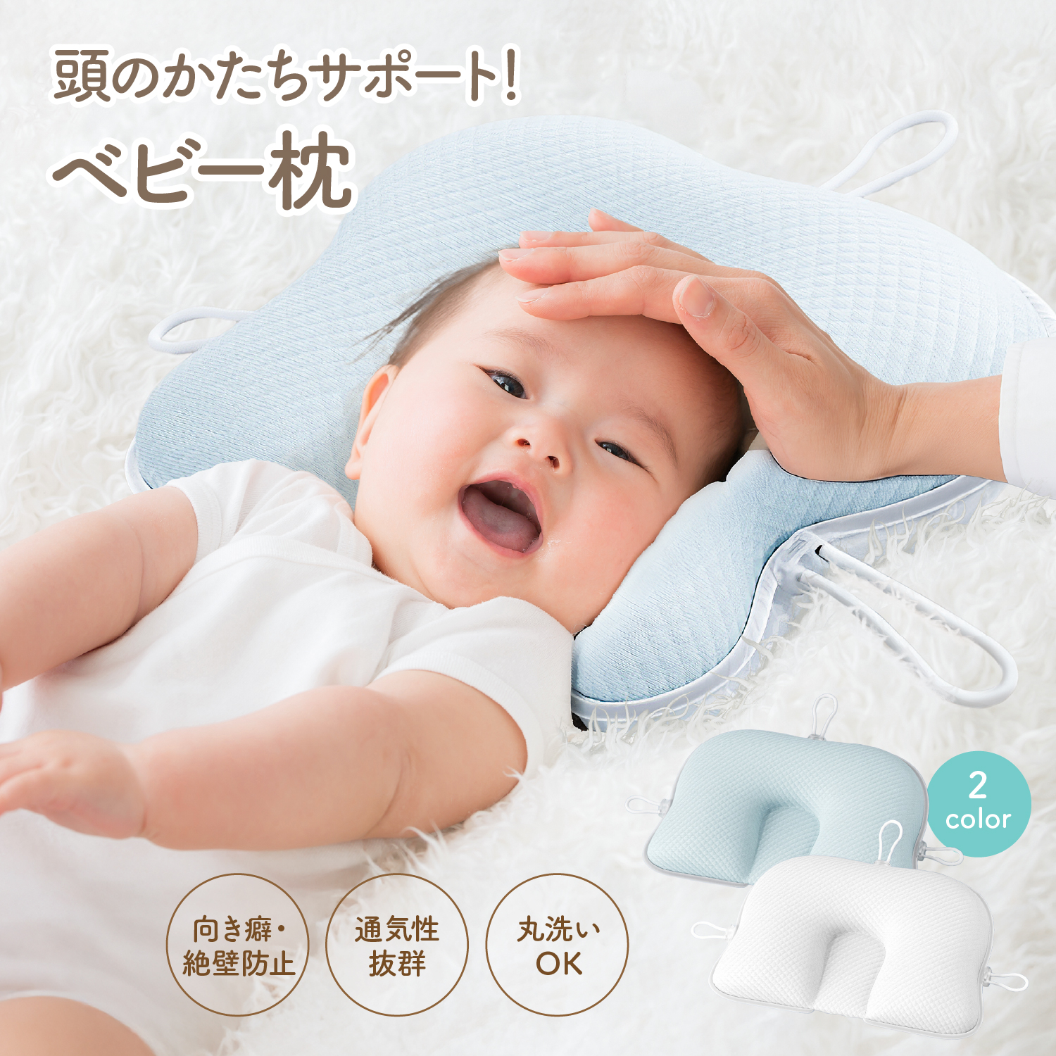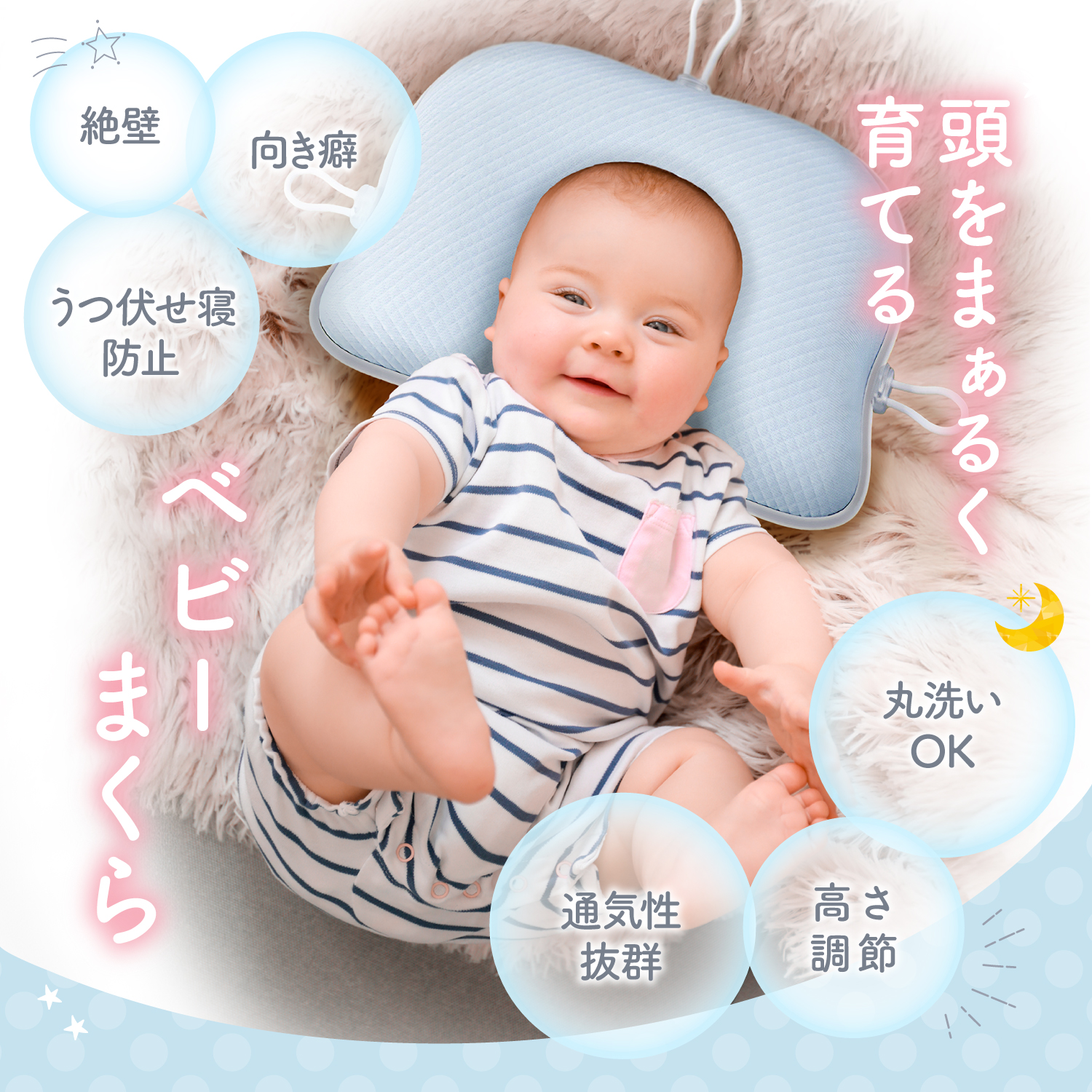 赤ちゃんに合わせて角度と高さが調節可能なベビー枕で、頭の高さと角度を調節する事で、向き癖や絶壁を防ぎます。