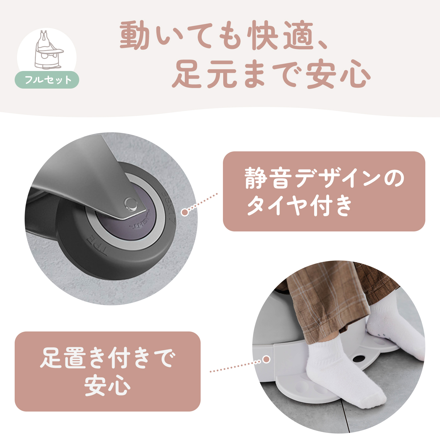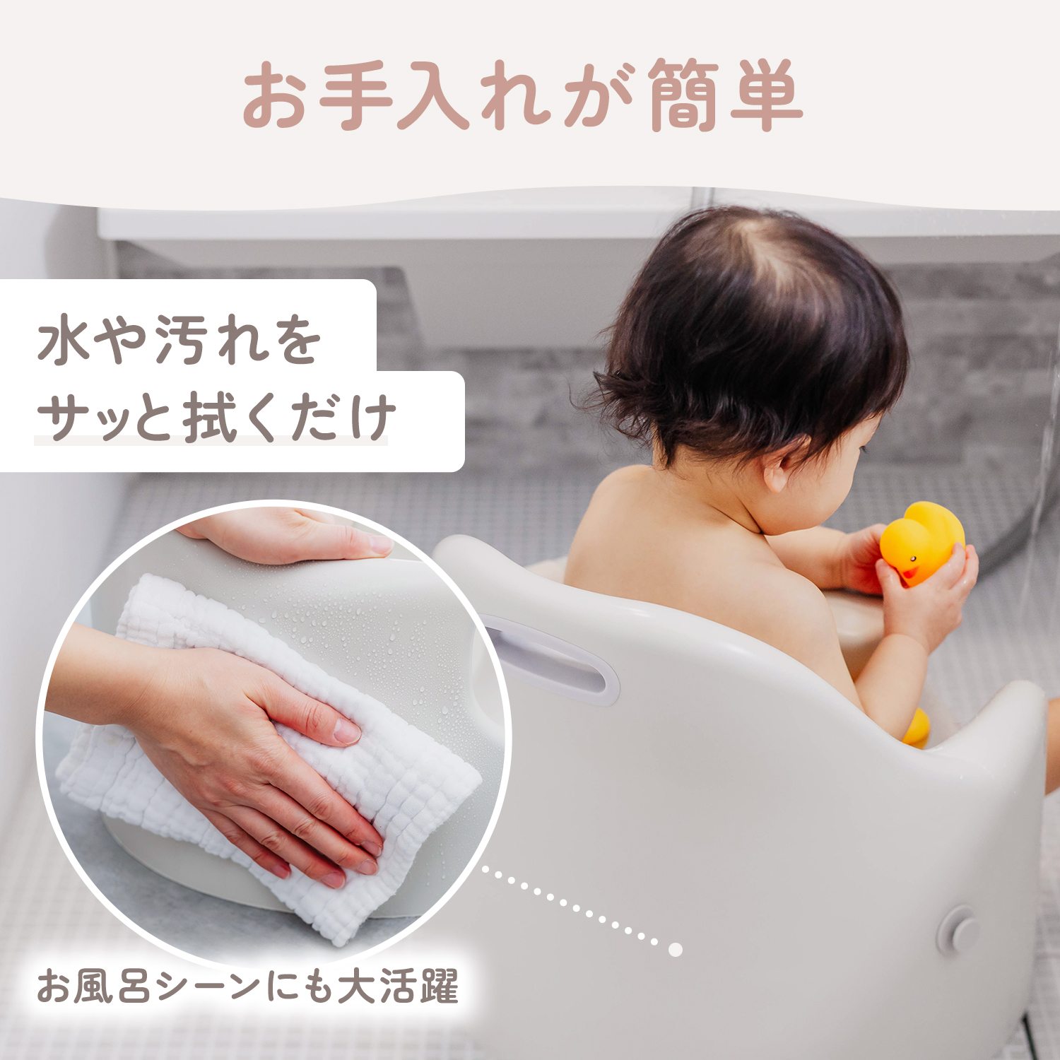 本体には防水PUクッション素材を使用。水や汚れを弾きやすく、食べこぼしや水滴もサッと拭くだけ。お風呂前後の待機チェアとしても使いやすい素材です。