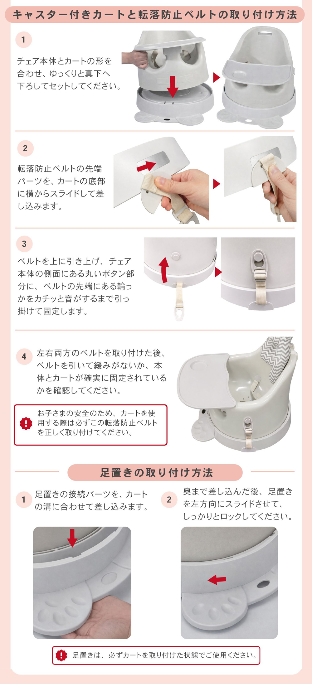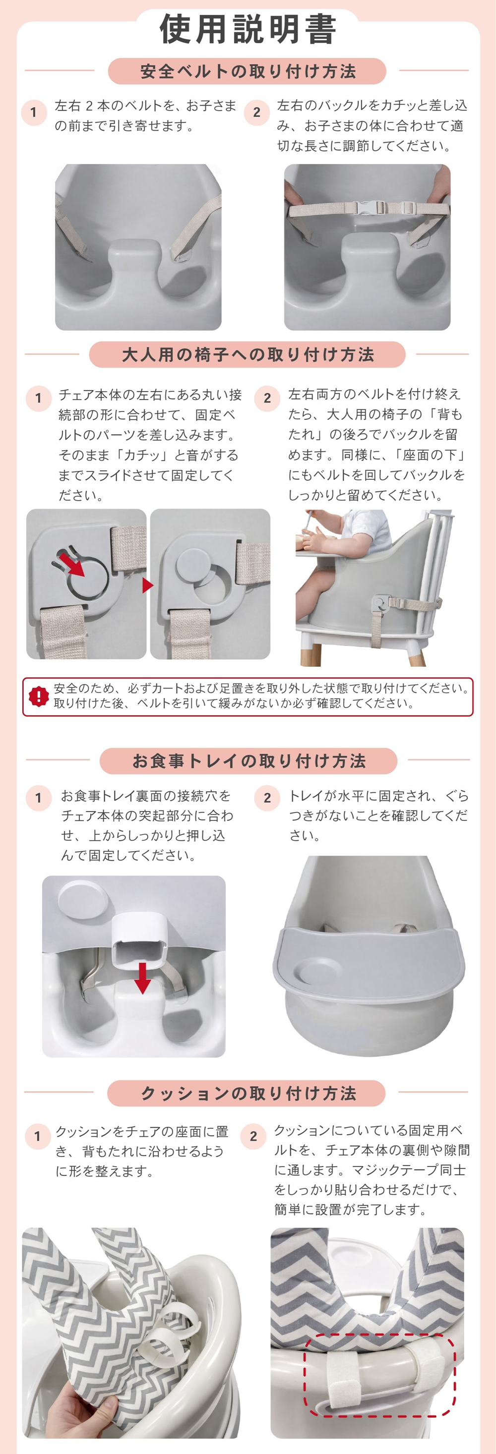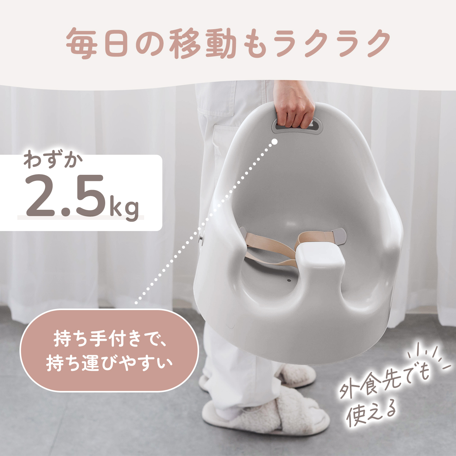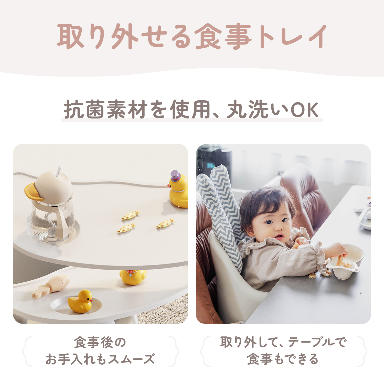 床置きで使えるローチェアとしてはもちろん、椅子に取り付けてハイチェアとしても使用できる2WAY仕様。成長に合わせて使えるため、長く活躍するベビーチェアです。