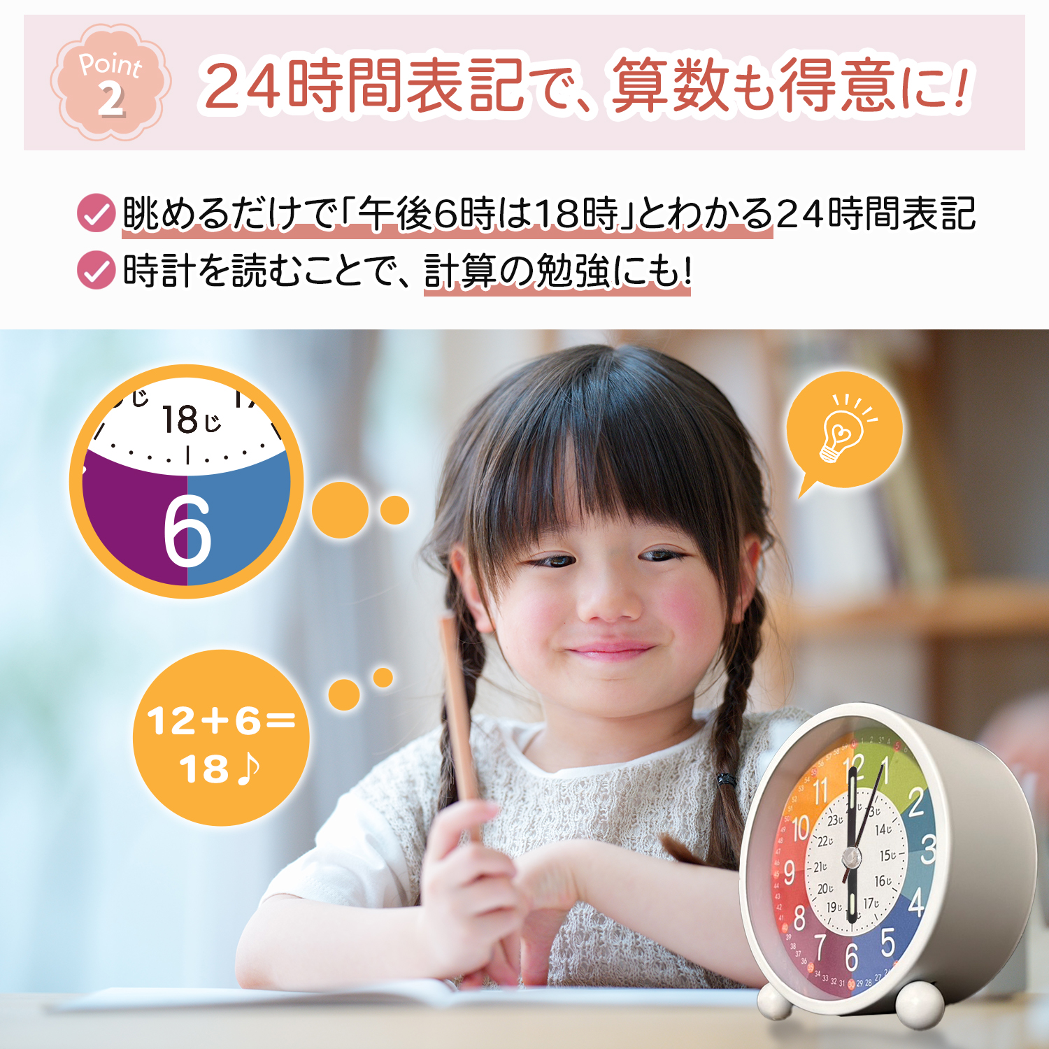 眺めるだけで「午後6時=18時」と覚えられる文字盤。