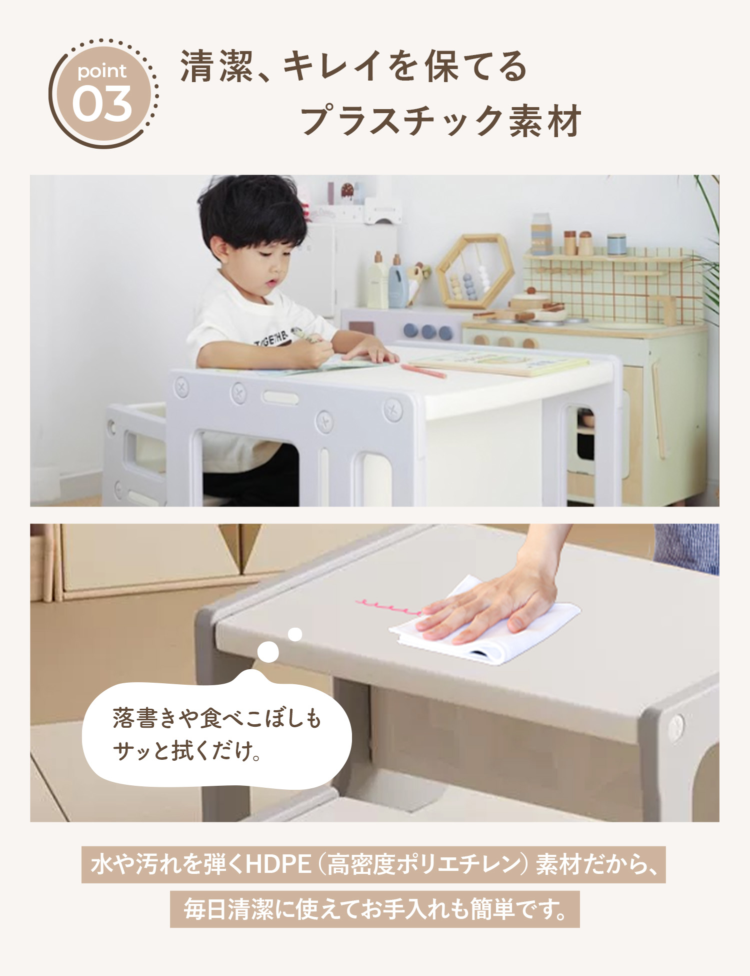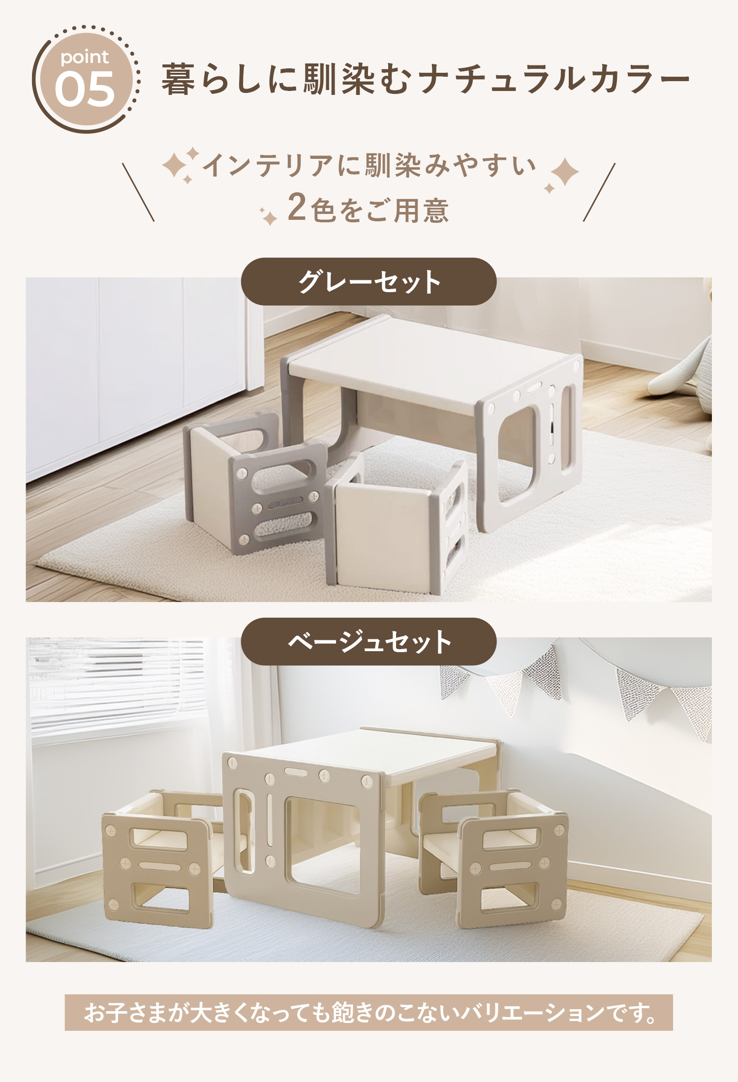 そんなお声にお応えした、テーブルや学習机としてはもちろん、ベンチ・収納とマルチで使える子供用テーブル&チェアセット!