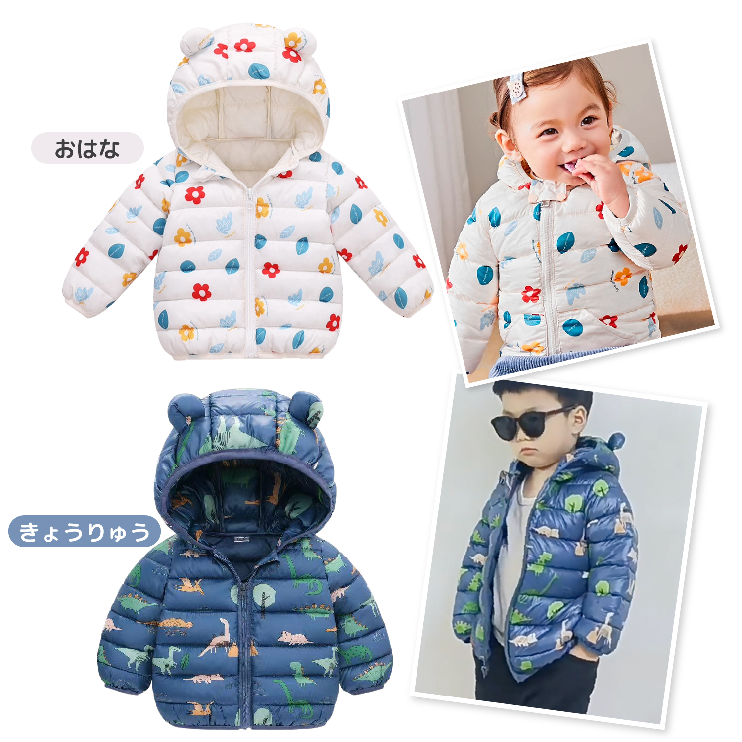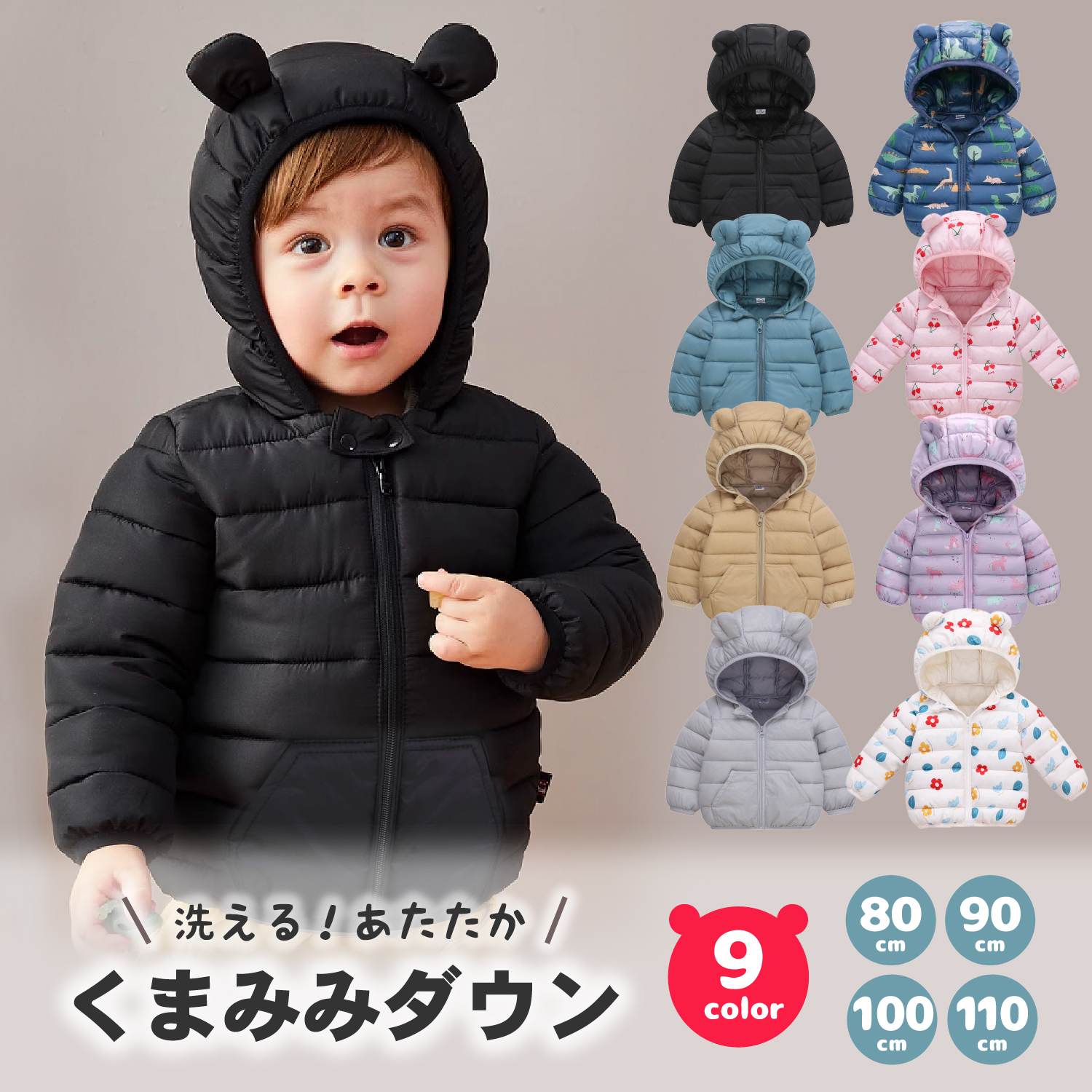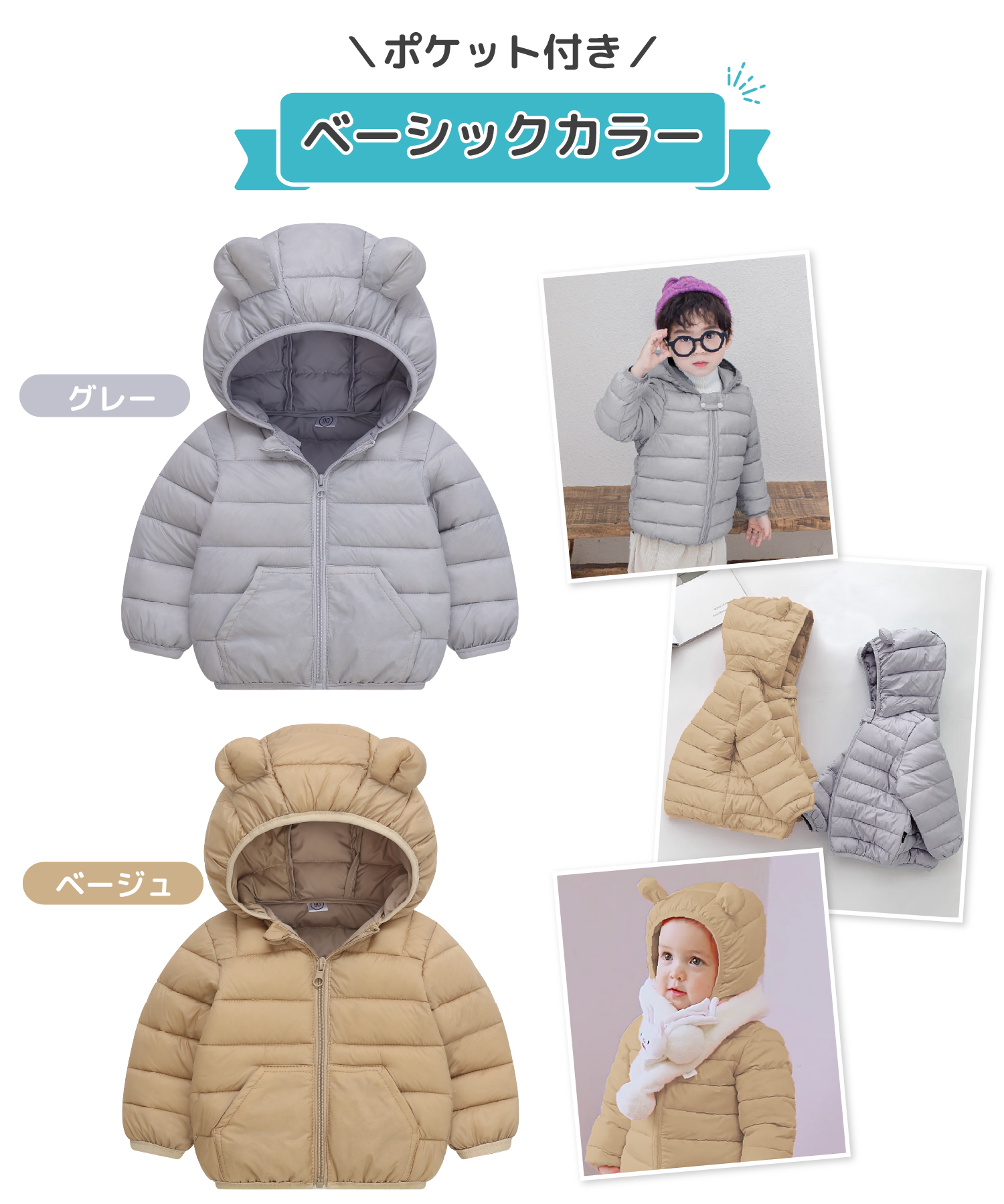シンプルな無地のデザインと個性豊かなデザインの展開なので、好みに合わせてぴったりのものが見つかります。シンプルながらもフード部分のくま耳デザインが子どもらしい可愛さを演出してくれます。