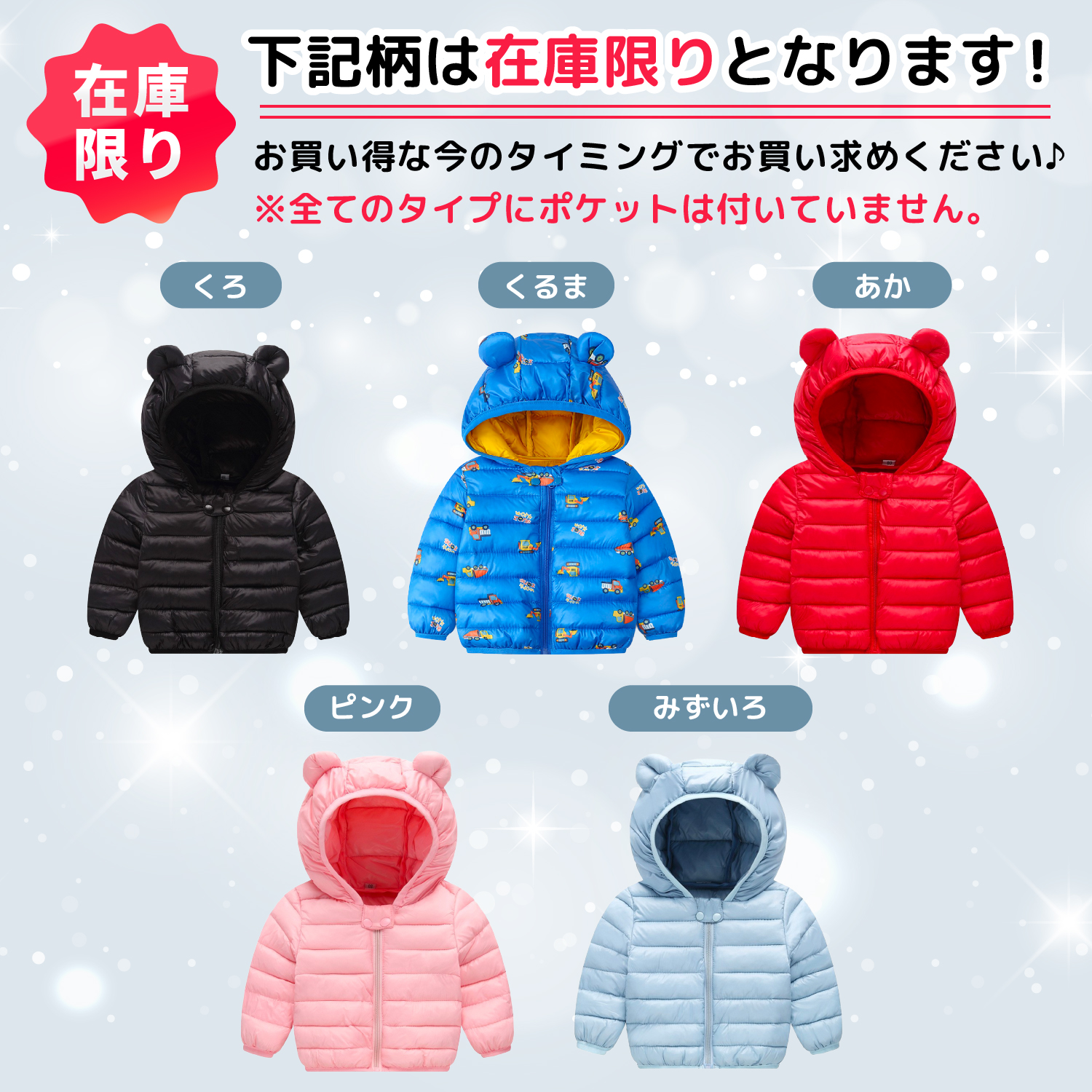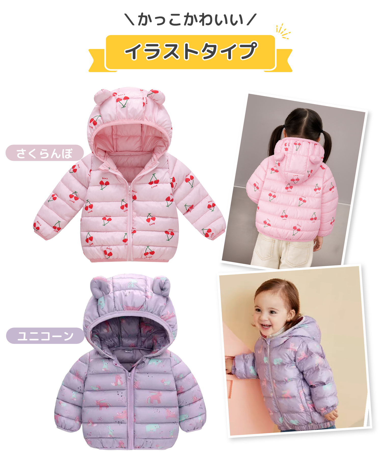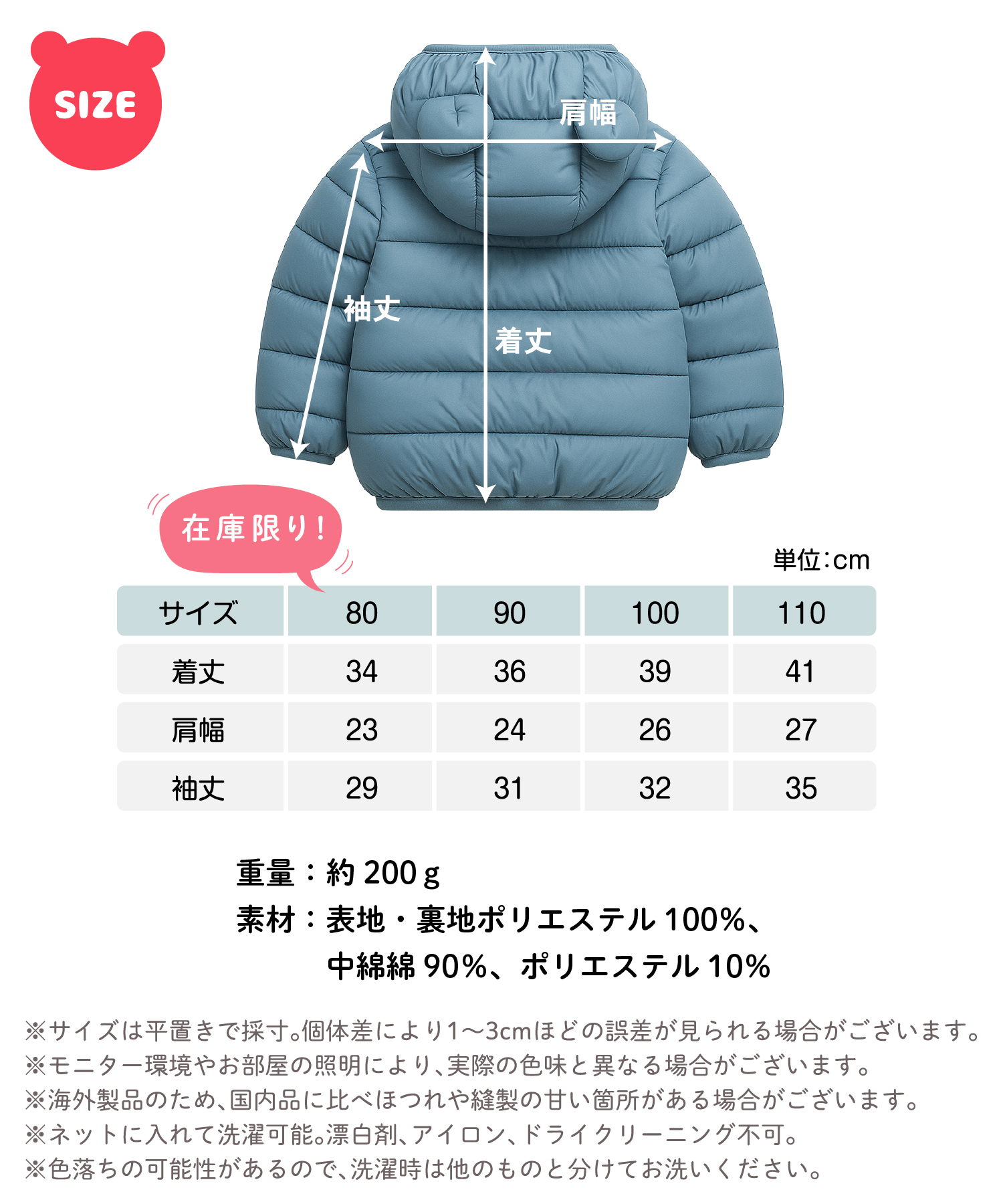 中綿入りで保温効果が抜群!冬の厳しい寒さからお子様を守ります。また、ダウンに比べてお手入れがしやすいので汚れたら自宅の洗濯機で簡単に洗うことができて衛生的!コスパ良し◎