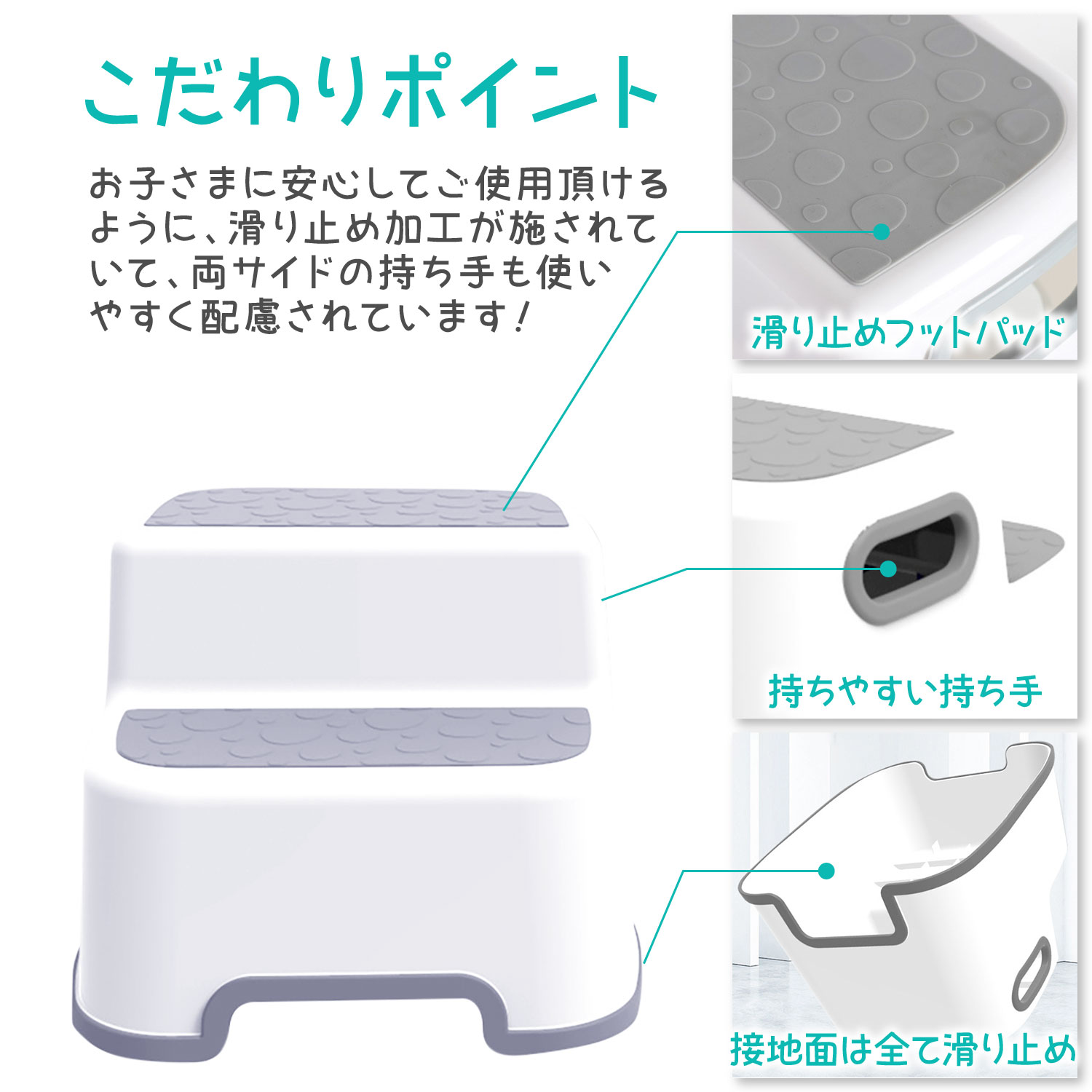 お子さまに安心してご使用頂けるように、滑り止め加工が施されていて、両サイドの持ち手も使いやすく配慮されています!